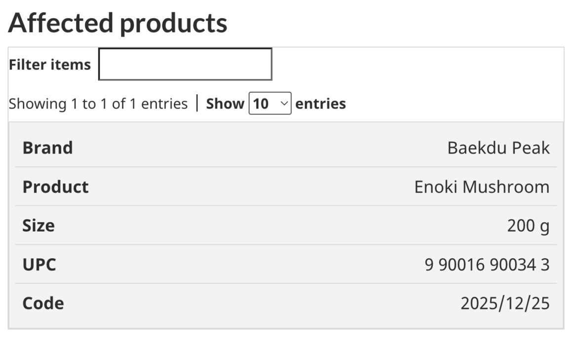 The Canadian Food Inspection Agency (CFIA) has just announced that Baekdu Peak brand Enoki Mushrooms are being pulled from shelves due to possible contamination with Listeria monocytogenes.