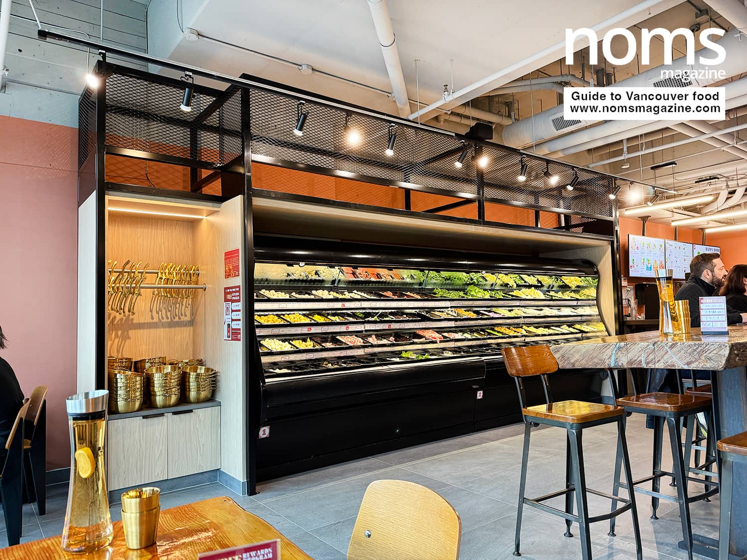 You grab a golden bowl and load up from the massive refrigerated wall stocked with over 100 ingredients.