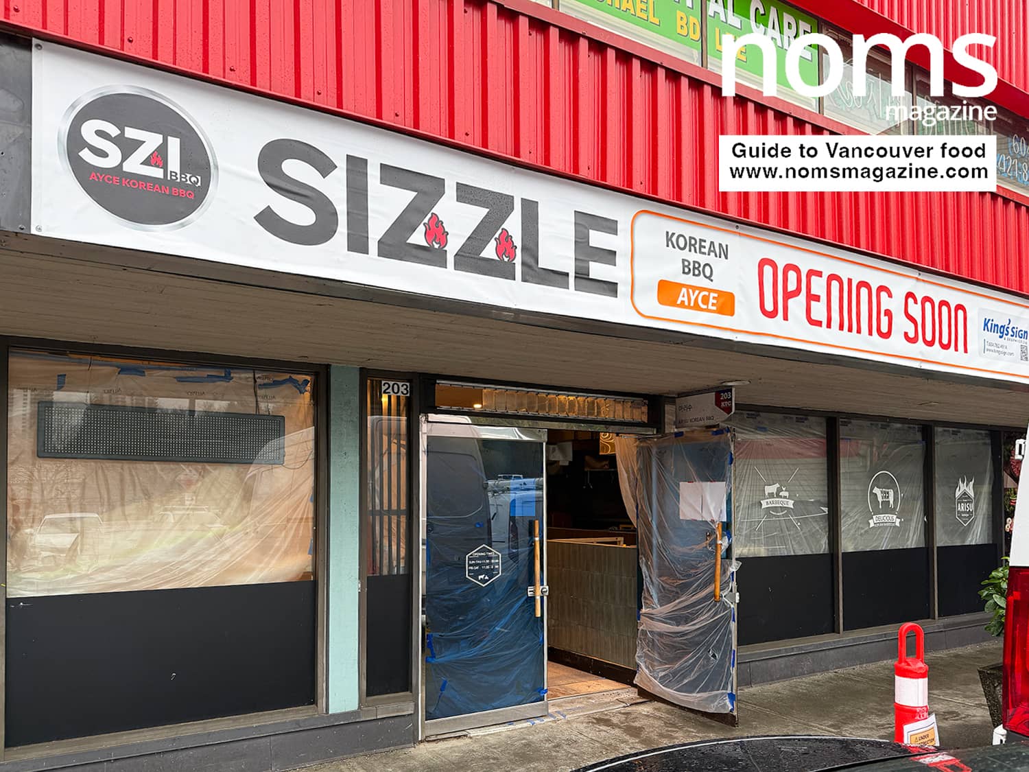 A large banner across the storefront confirms what is coming next. The space is being taken over by Sizzle, a new all-you-can-eat Korean BBQ concept that is currently marked as “Opening Soon.”