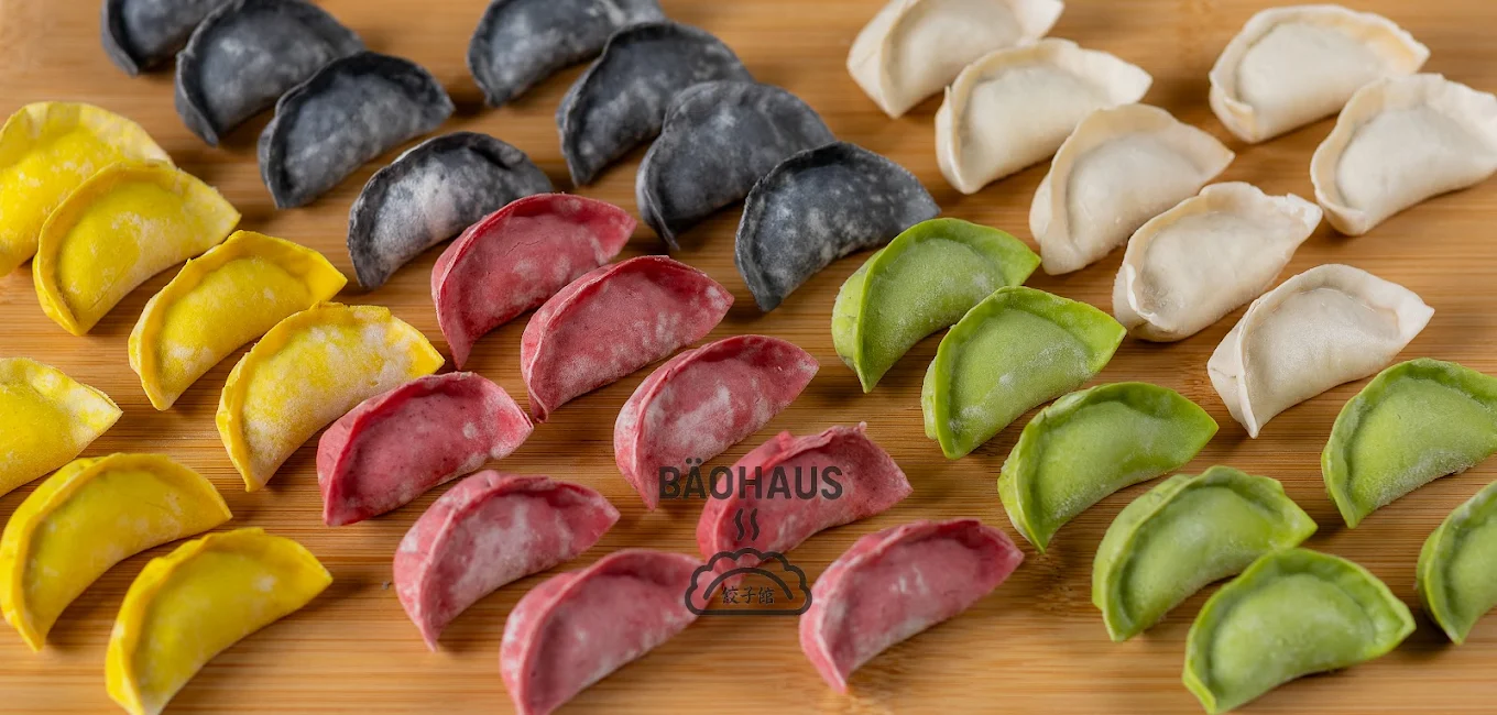 Photos show dumplings in vibrant shades of green, yellow, black, red, and white, likely using vegetables for the dough.