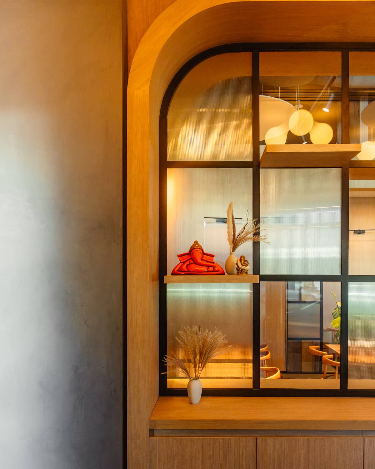 The space is rich in texture and handcrafted detail, blending cultural motifs with contemporary design to reflect Tondvalkarโs vision of modern Indian dining.