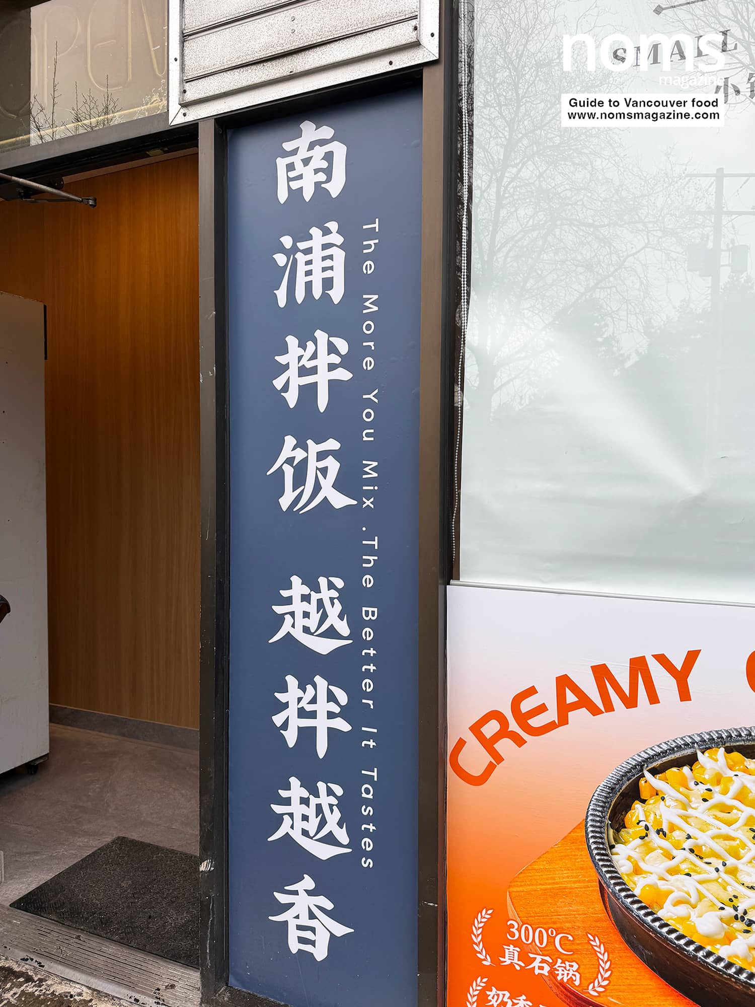 The exterior branding highlights dishes like Cumin Beef Sizzling Rice Bowls, Kimchi Pork Belly, and Slate Egg Tofu.