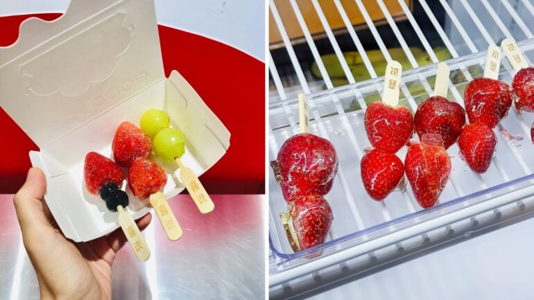 The brand is famous for its tanghulu, a traditional Chinese street snack that features skewered fruits dipped in a glossy sugar shell that hardens into a satisfying crunch.