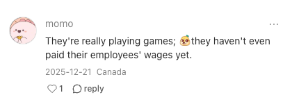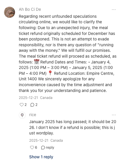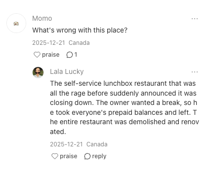 There was one person responding to comments claiming to be a representative, telling people to contact the official Red Note account for help when the restaurant suddenly closed in November/December.