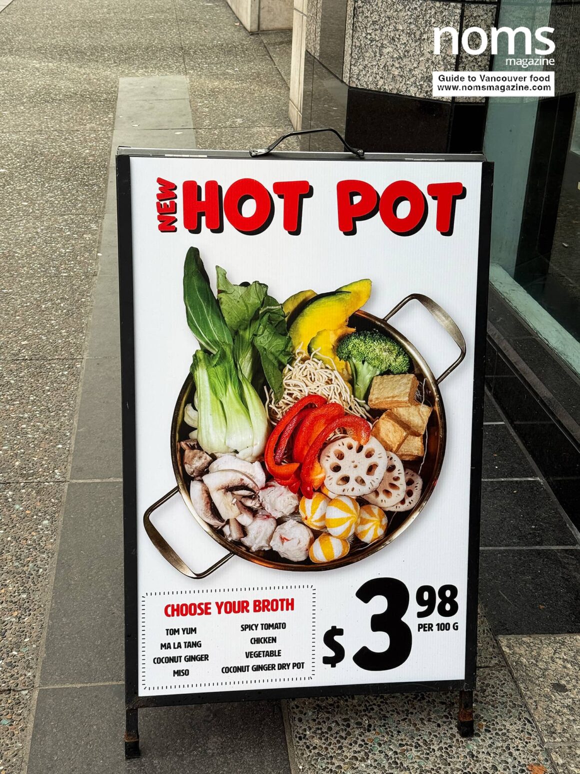 The signage out front now reads “HGK Hungry Guys Kitchen Hot Pot,” with an A-frame sign advertising the new offering at $3.98 per 100 grams.