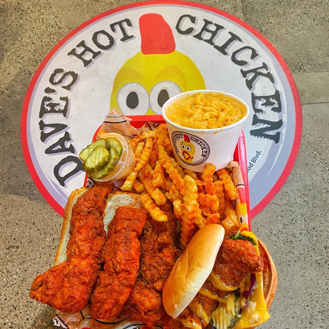 The wildly popular Los Angeles–based chain is known for its cult following, massive hot chicken tenders, and sliders that pack serious heat.