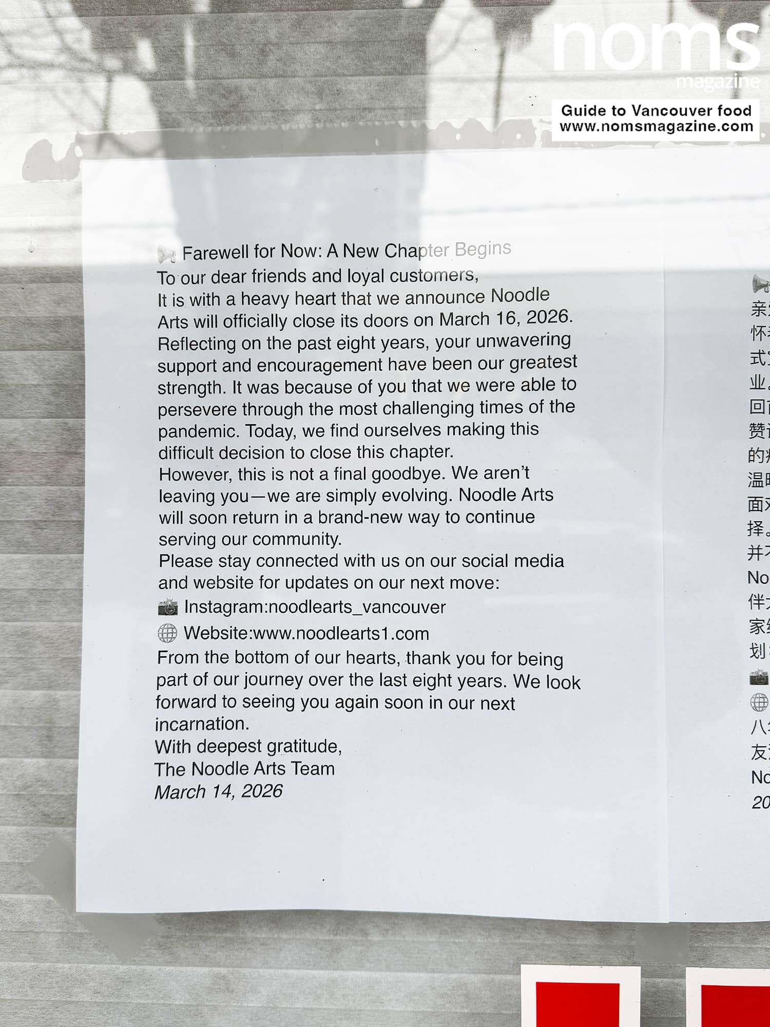 Noodle Arts now joins other recently closed food spots in Vancouver, including Pho Q&M, MeeT in Yaletown, and Bacaro.