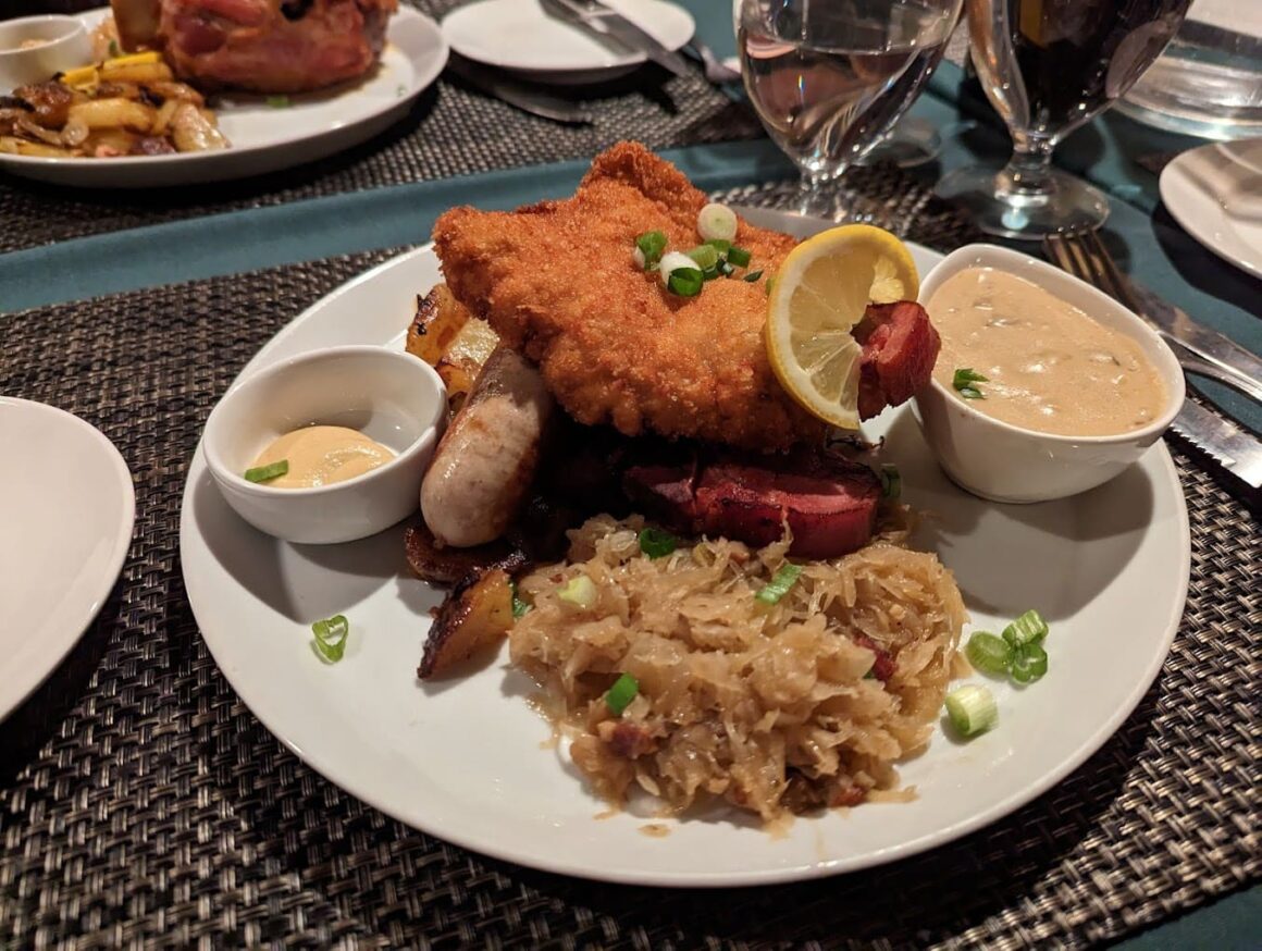 The Jäger Schnitzel is one of the tastiest dishes that comes with a perfectly cooked thin slice of pork served with pan-fried potatoes, red cabbage, and triple mushroom sauce – a perfect creamy addition to the crispy schnitzel!