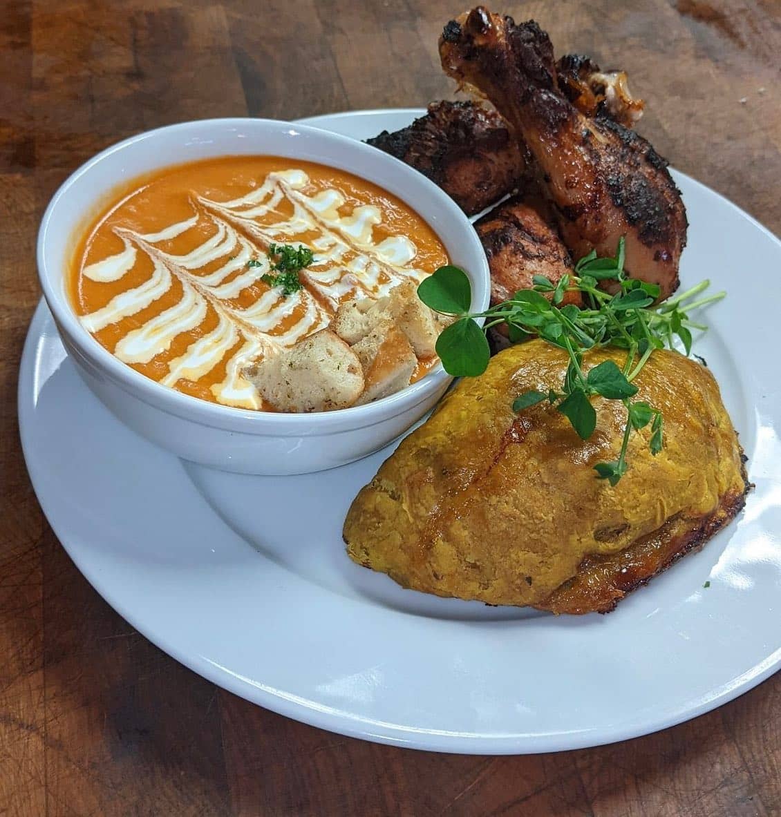Start with the Bruschetta—fresh herbed focaccia layered with a creamy three-cheese spread, basil pumpkin seed pesto, and a sun-dried tomato coulis, all drizzled with balsamic glaze.