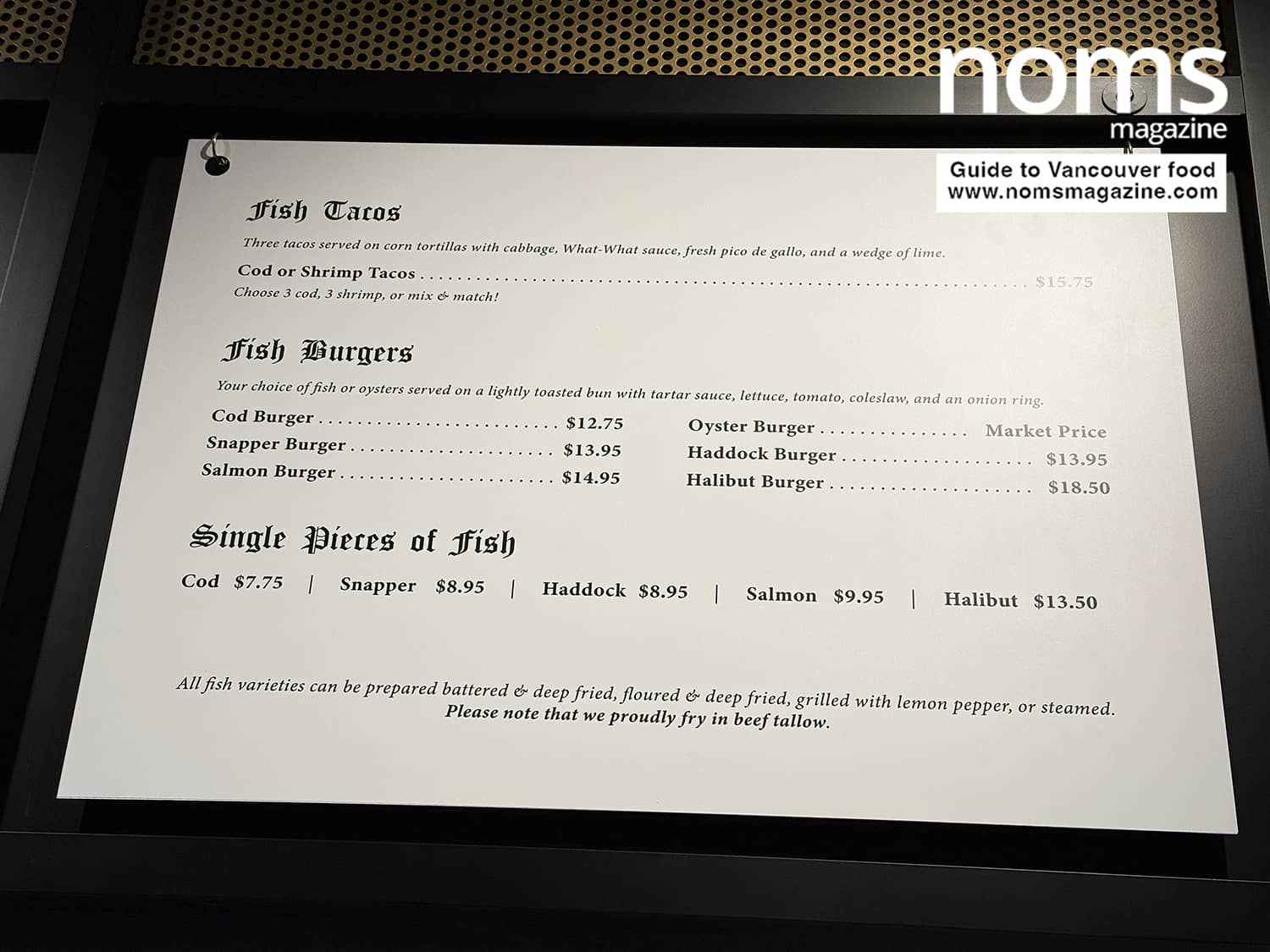 You can choose from cod, snapper, haddock, salmon, and halibut, with options to have your fish battered and deep fried, floured and deep fried, grilled with lemon pepper, or steamed.