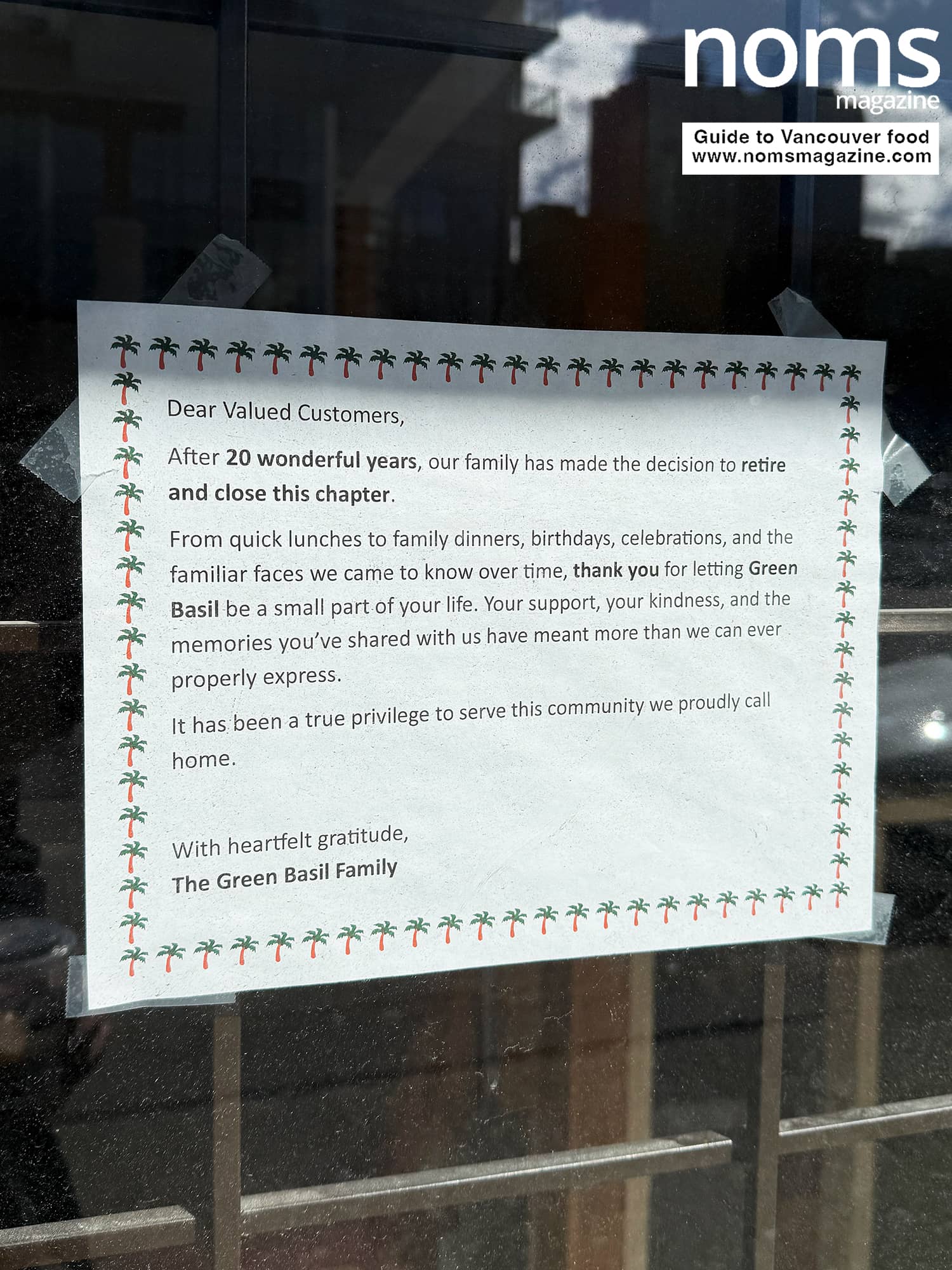 “From quick lunches to family dinners, birthdays, celebrations, and the familiar faces we came to know over time, thank you for letting Green Basil be a small part of your life,” it reads.