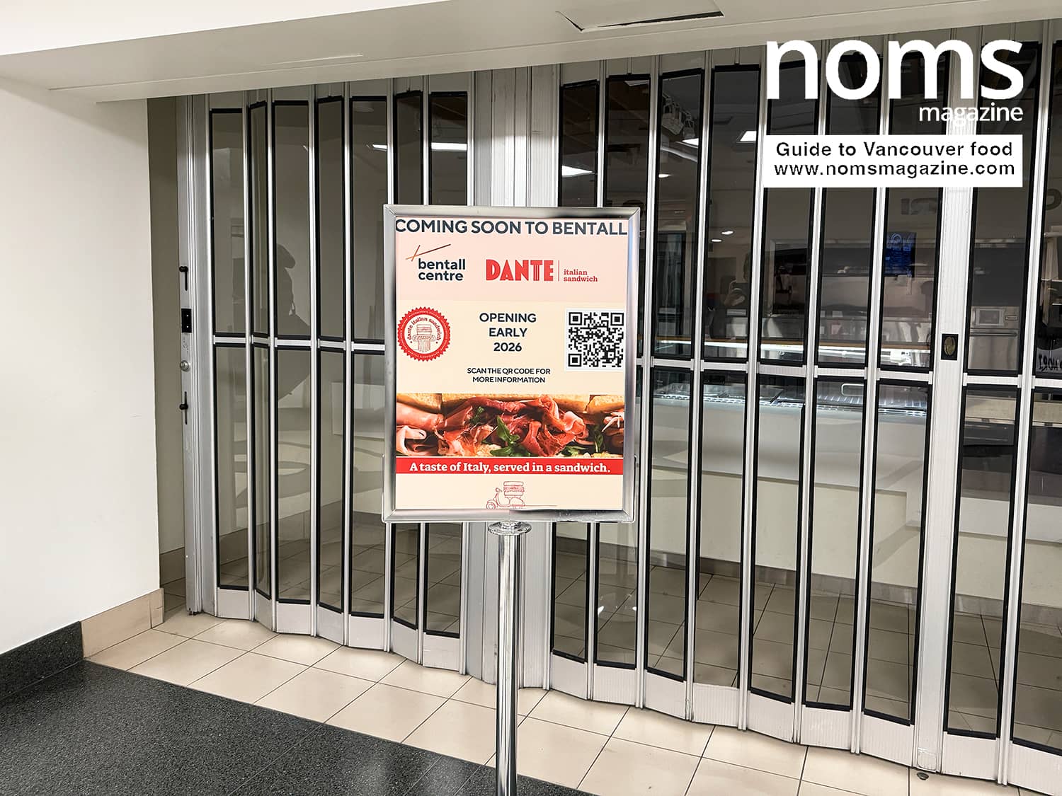 During a recent walk through Bentall Centre, we spotted new signage announcing that Dante Italian Sandwich is coming to the lower food court, right across from Taco Nori.