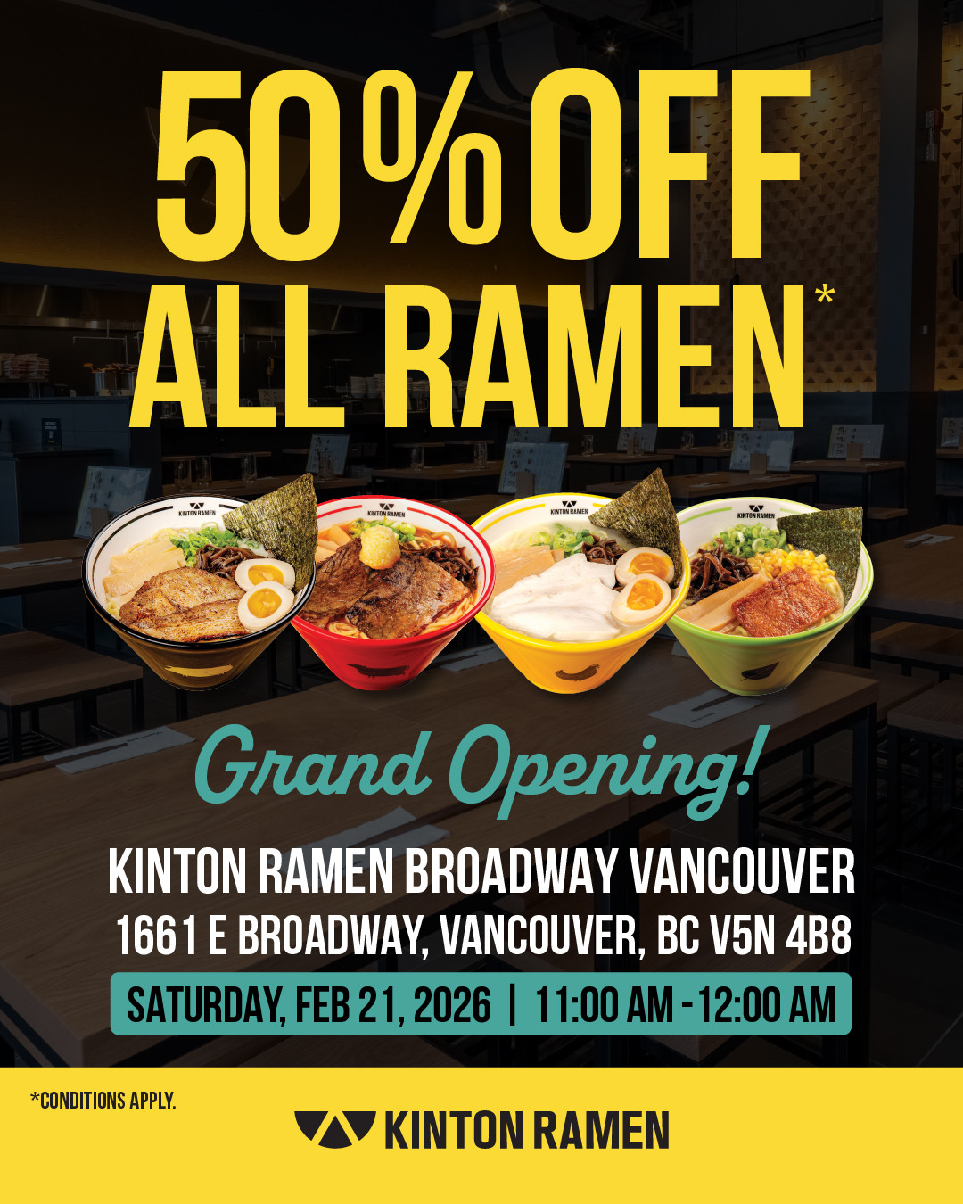 Kinton Ramen on East Broadway is holding its official grand opening on Saturday, February 21, 2026, and they are offering 50 percent off all signature ramen to celebrate.