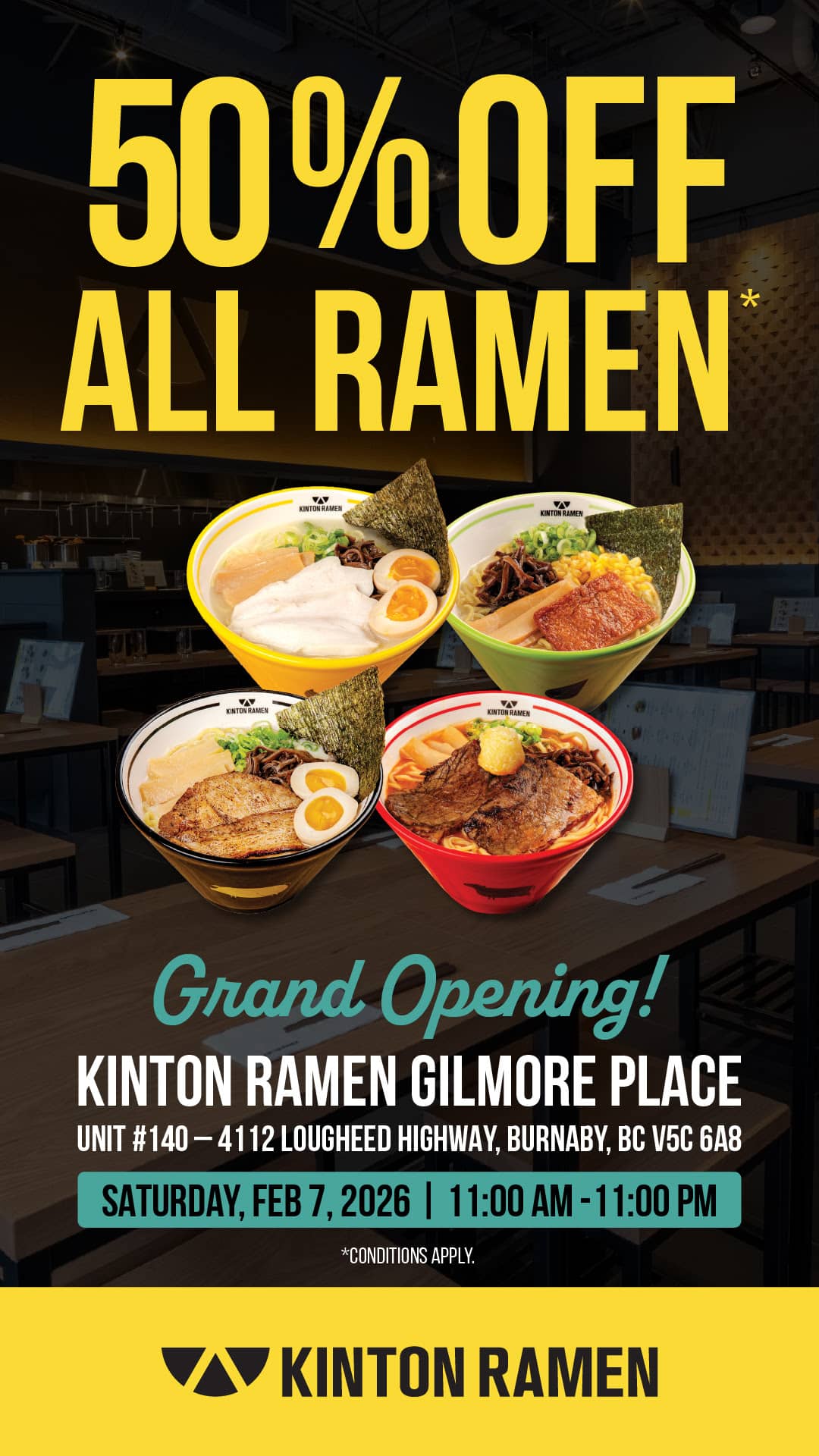 Kinton Ramen is hosting its grand opening on Saturday, February 7, and to celebrate, the restaurant is offering 50% off all ramen for dine-in guests.