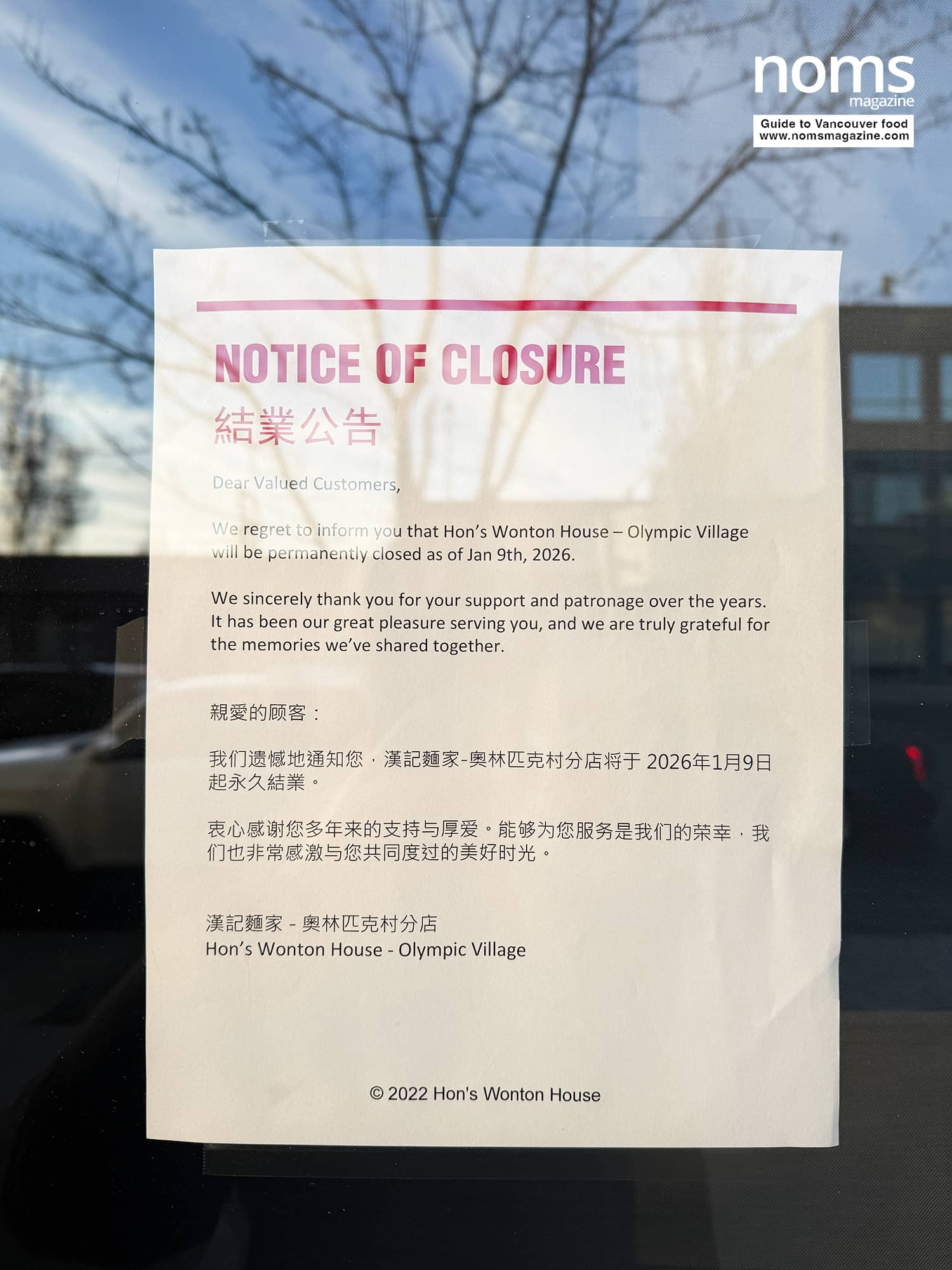 The sign reads: “We regret to inform you that Hon’s Wonton House – Olympic Village will be permanently closed as of Jan 9th, 2026.”