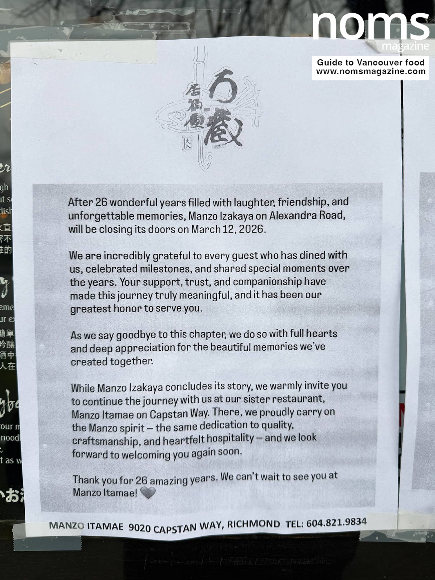 “After 26 wonderful years filled with laughter, friendship, and unforgettable memories, Manzo Izakaya on Alexandra Road, will be closing its doors on March 12, 2026,” the notice reads.
