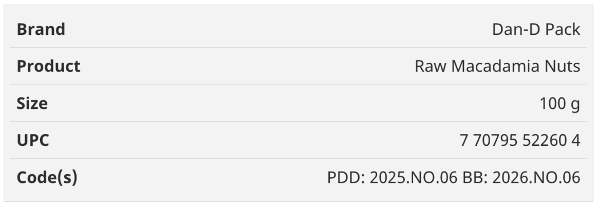 The Canadian Food Inspection Agency has issued a recall for Dan-D Pak brand Raw Macadamia Nuts due to possible Salmonella contamination in BC & Alberta.