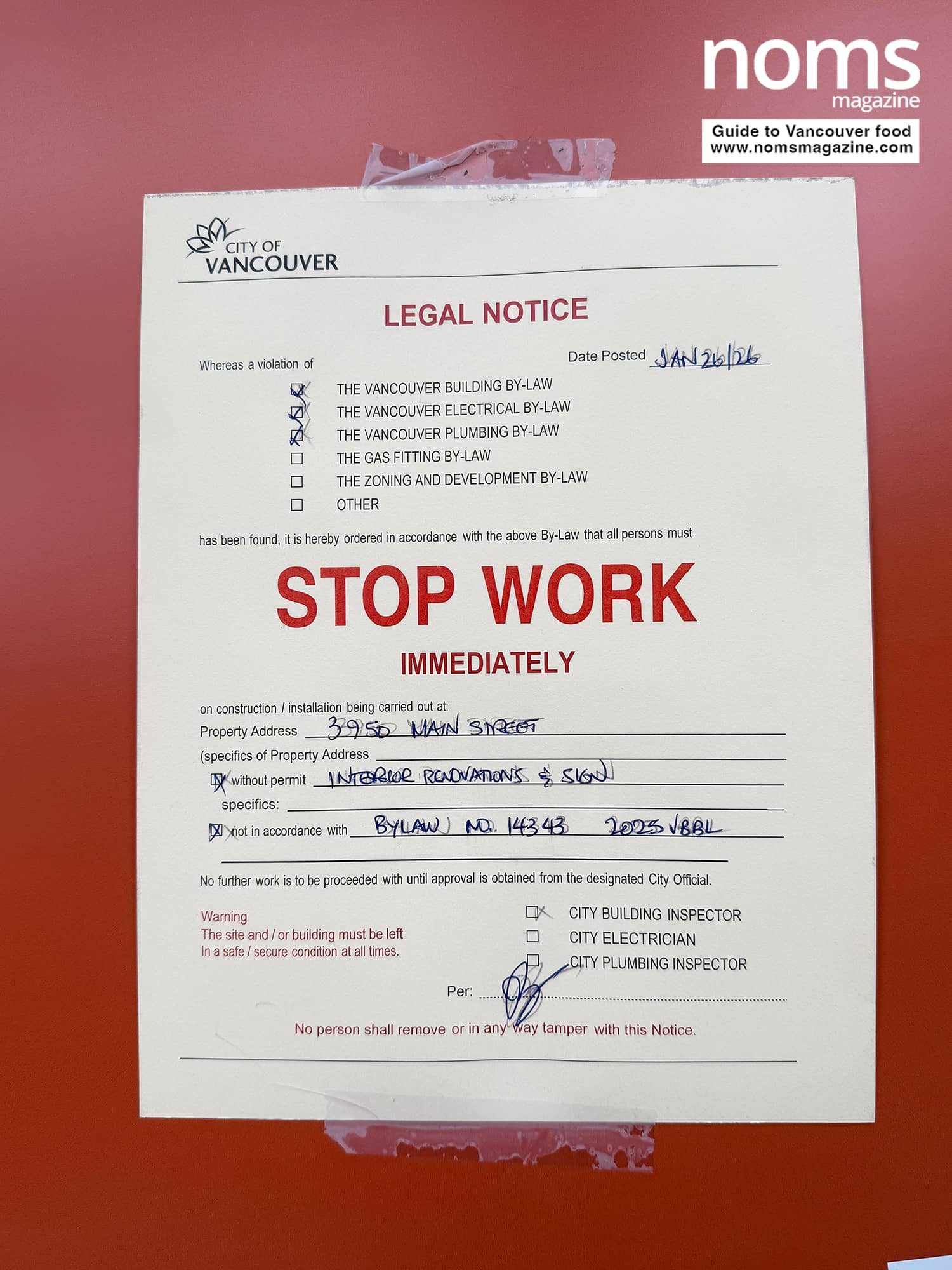 We spotted a City of Vancouver “Stop Work Immediately” notice posted on the door of the upcoming brunch restaurant at 3950 Main Street.