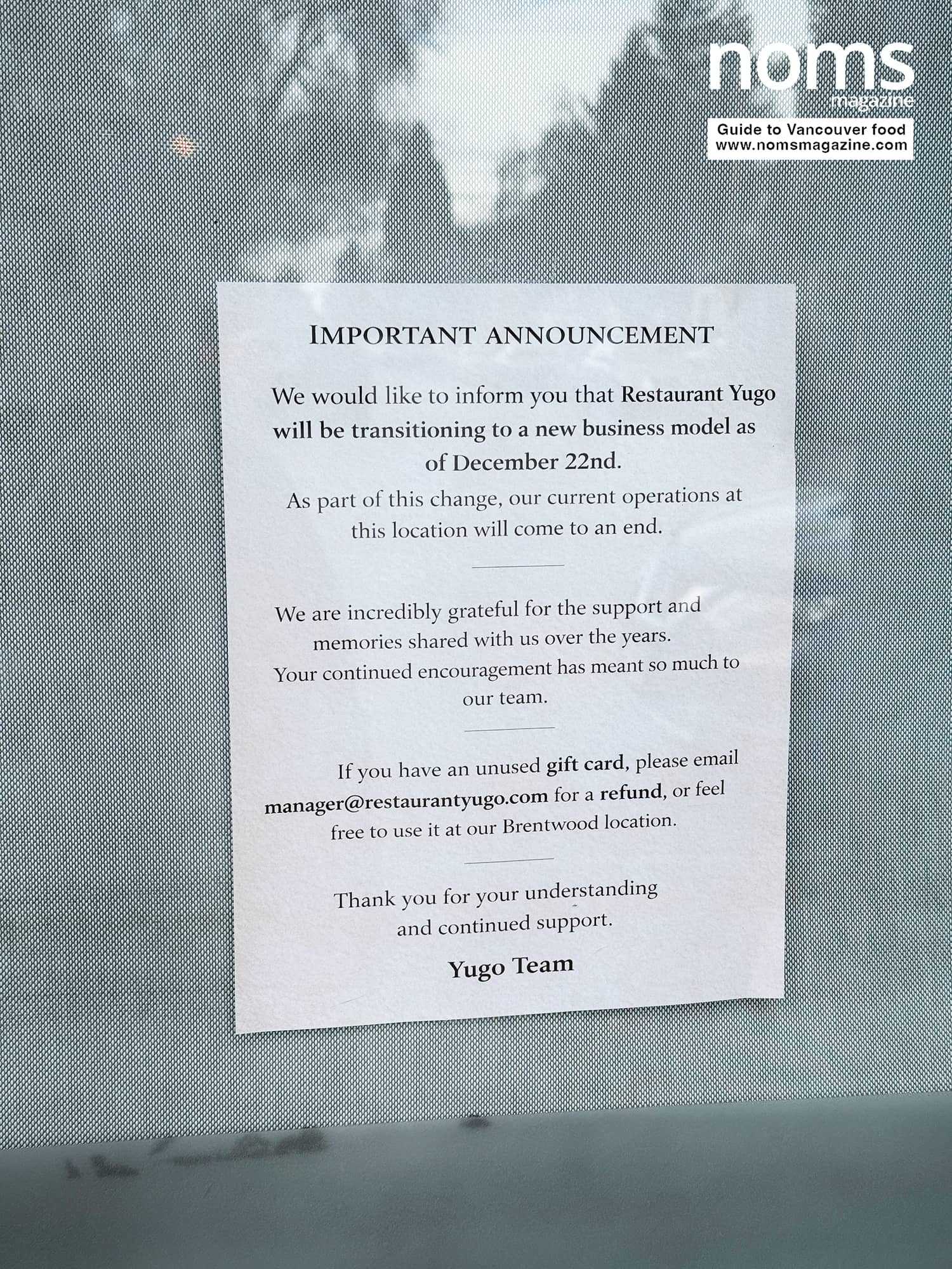 A Noms Magazine community member spotted the closure notice taped to the window, confirming what many regulars feared.