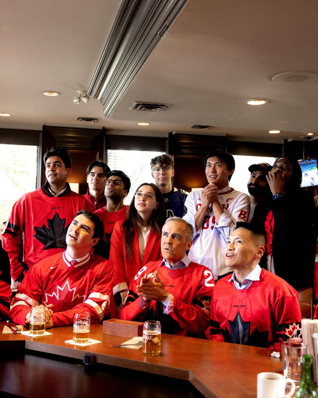The PM in a hockey jersey, a burger on the table, and a restaurant full of fans cheering together.