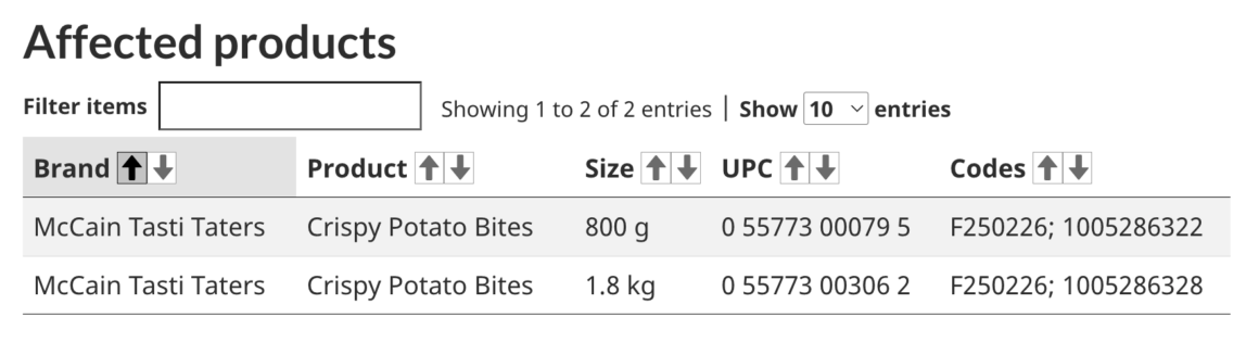 The Canadian Food Inspection Agency has issued a recall for specific batches of McCain Tasti Taters brand Crispy Potato Bites.