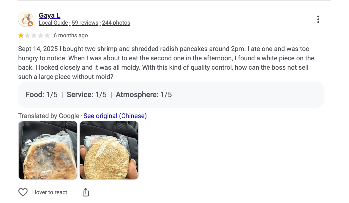 One reviewer from September 2025 wrote that they bought shrimp and radish pancakes and found mold on the back of one.