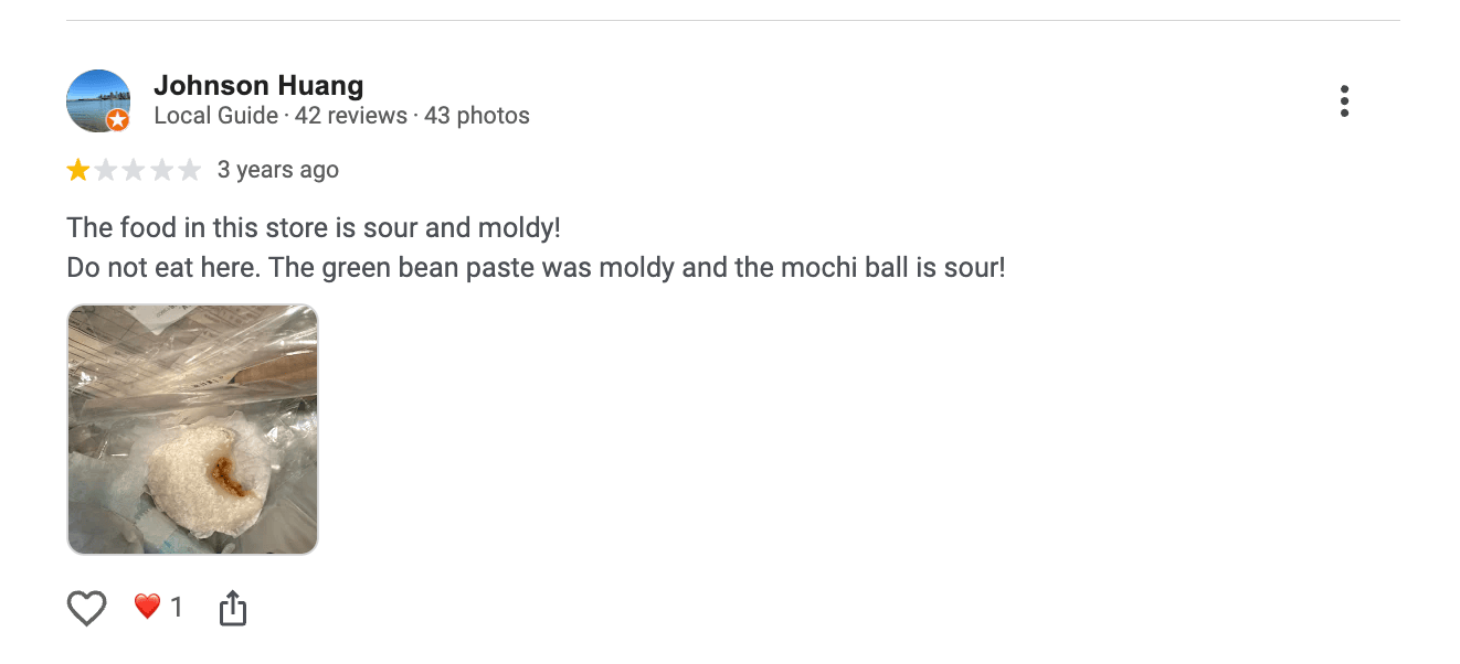 Another reviewer described finding moldy green bean paste and sour mochi.