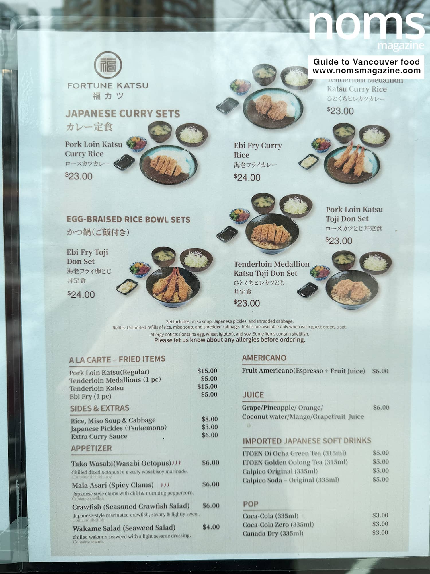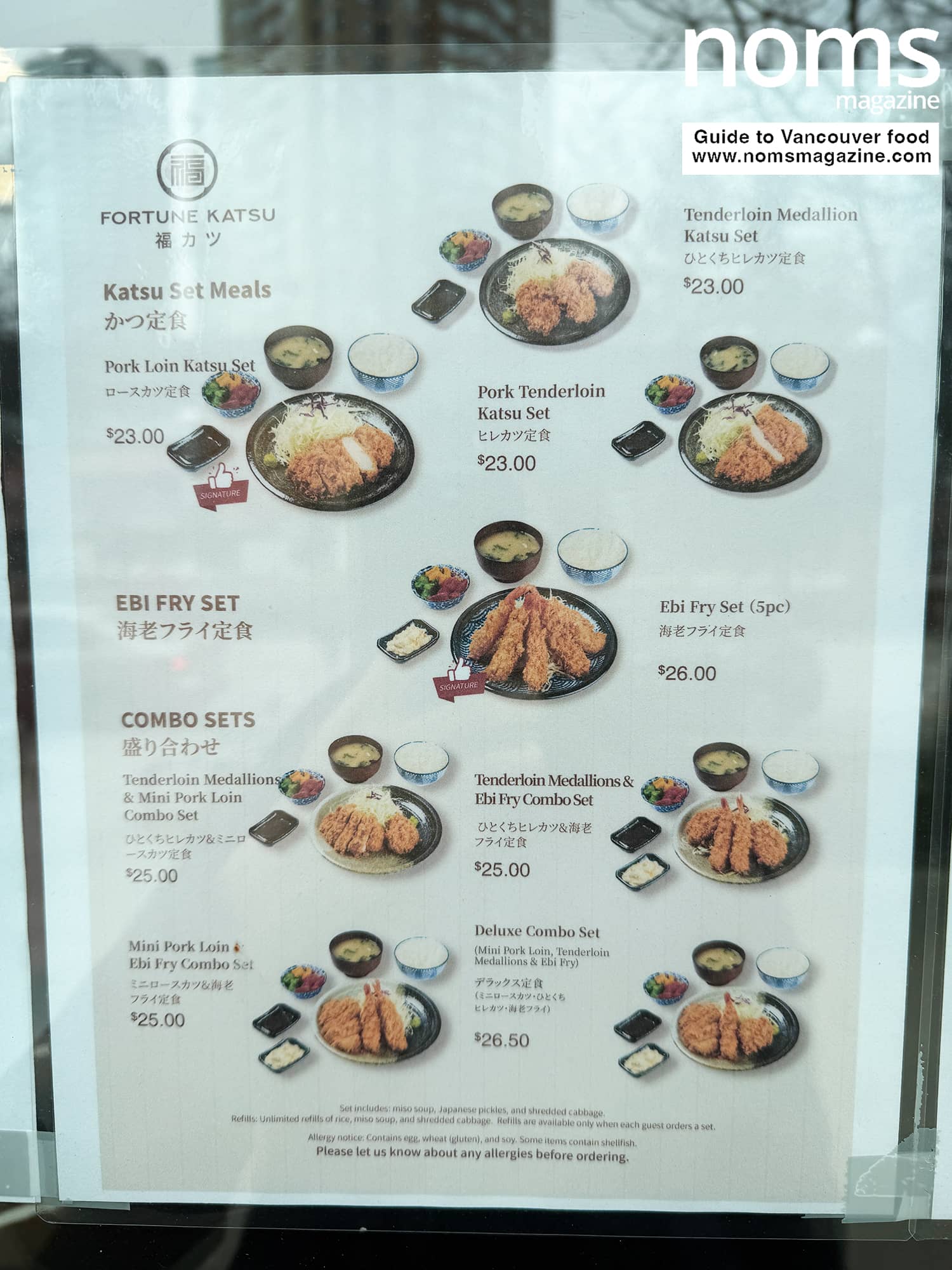 There are katsu set meals starting at $23, including pork loin katsu, pork tenderloin katsu, and tenderloin medallion katsu. The ebi fry set with five pieces of fried shrimp comes in at $26.
