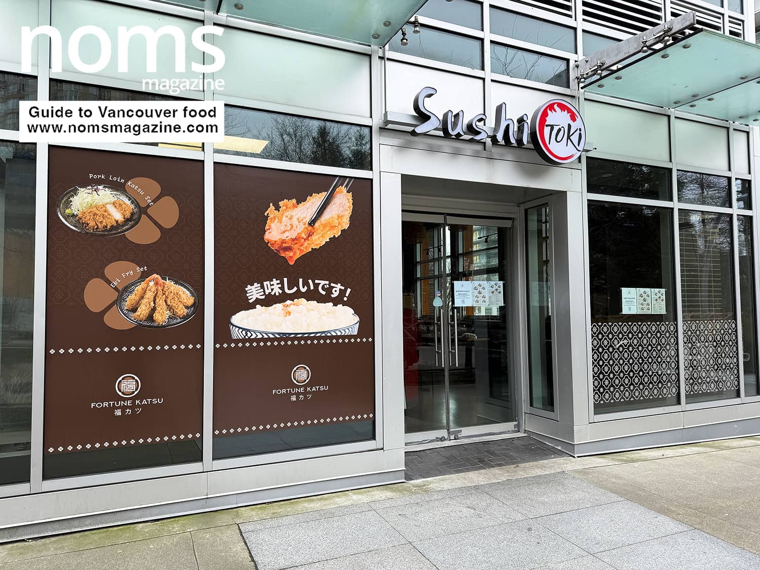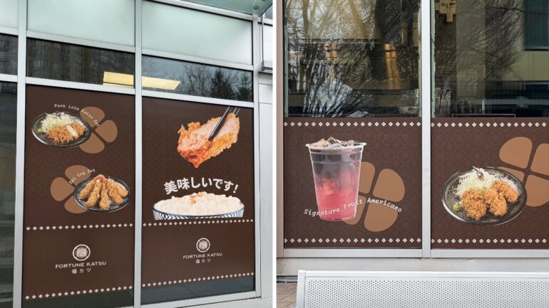 The old Sushi Toki sign is still hanging above, but the windows are covered in Fortune Katsu branding with photos of golden fried cutlets and bowls of rice.
