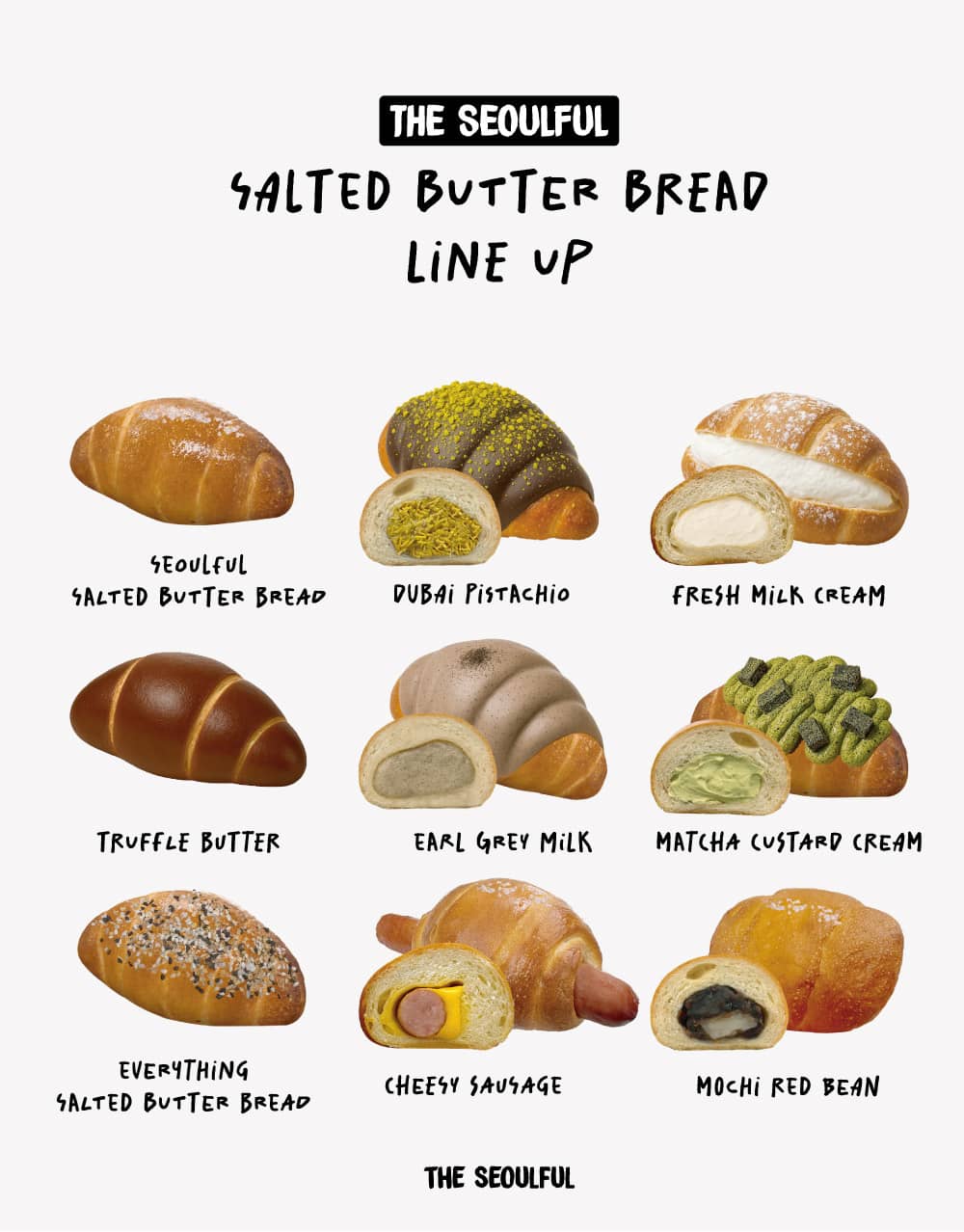 This includes Salt Bread in nine flavours like Classic, Fresh Milk Cream, Dubai Chocolate, Earl Grey, and Matcha.