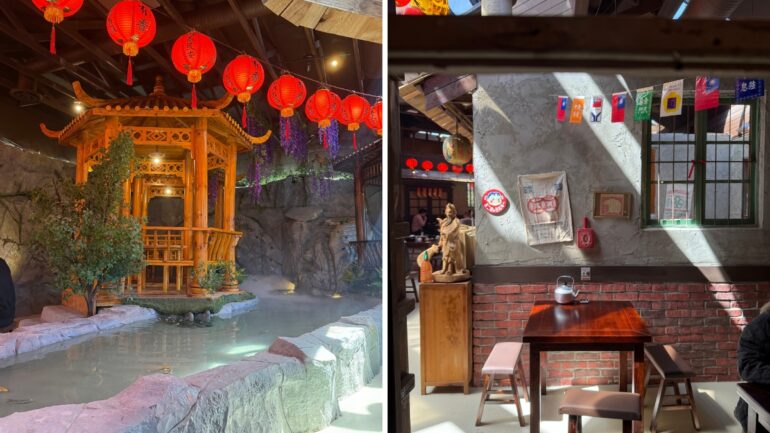 Around the water are cave-like walls, rock-style seating edges, and wooden pavilion structures that make the whole section feel like an old Taiwanese courtyard.