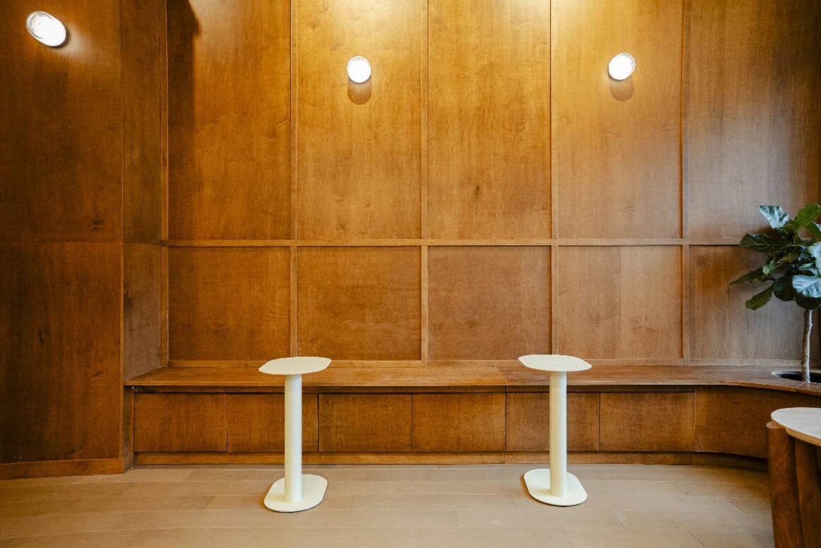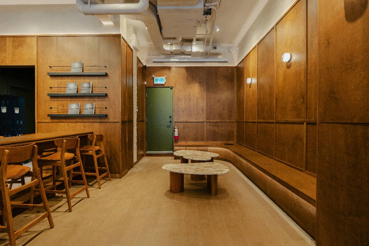 The Kitsilano location has a warm, refined look with rich wood paneling, soft lighting, and a sleek stone bar that gives the space a polished feel.