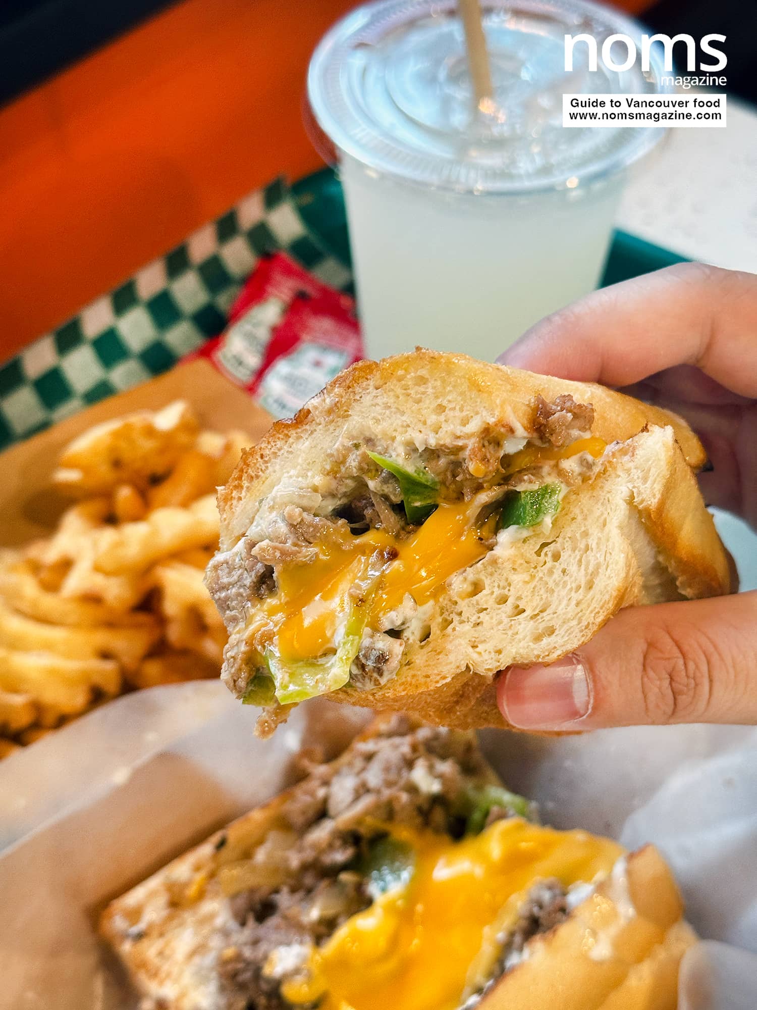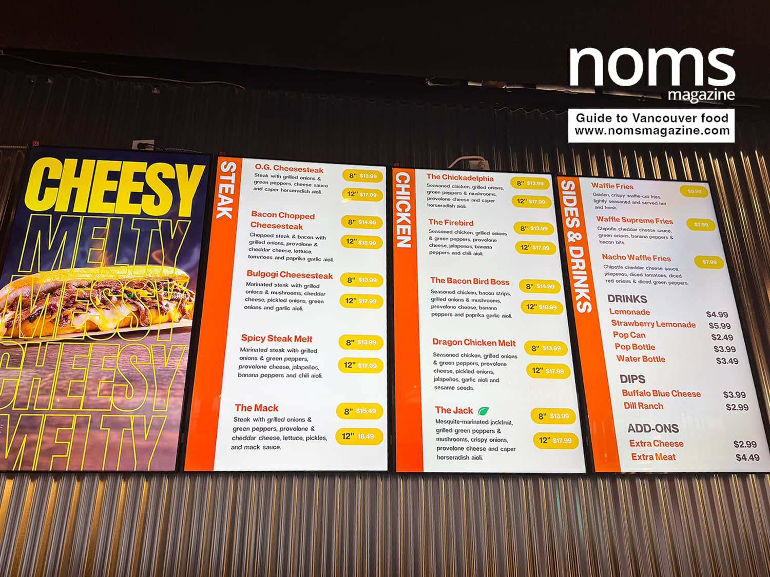 Options include the O.G. Cheesesteak (steak, onions, peppers, American cheese) or spicier versions like the Spicy Steak Melt with jalapeños.