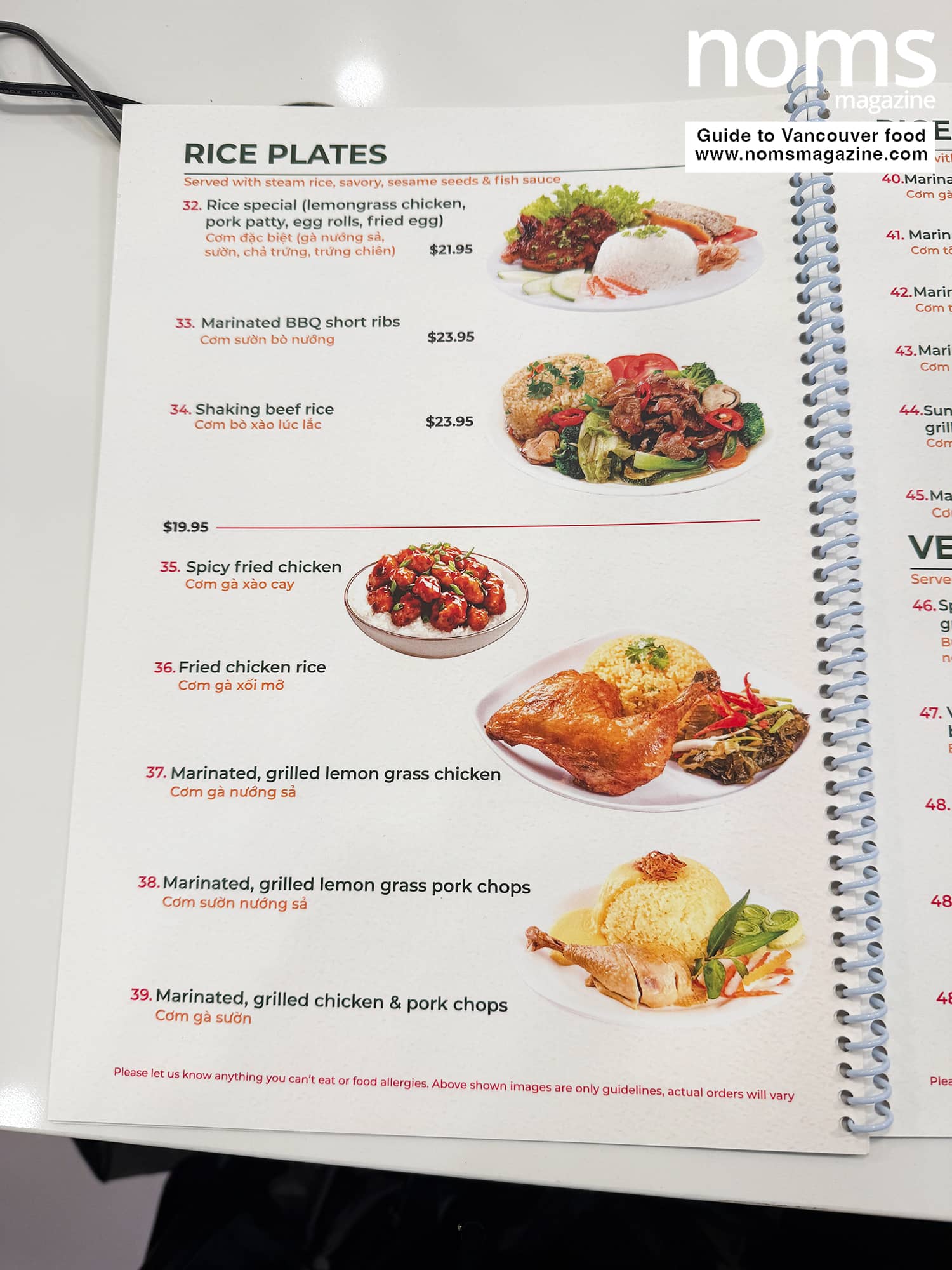 Rice plates include lemongrass chicken, lemongrass pork chops, shaking beef, BBQ short ribs, and spicy fried chicken.