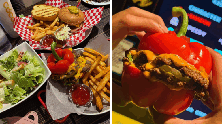 One standout swaps the bun for a grilled red bell pepper, holding together a juicy beef patty, melted cheese, and crisp lettuce. It’s lighter but still messy in the best way.