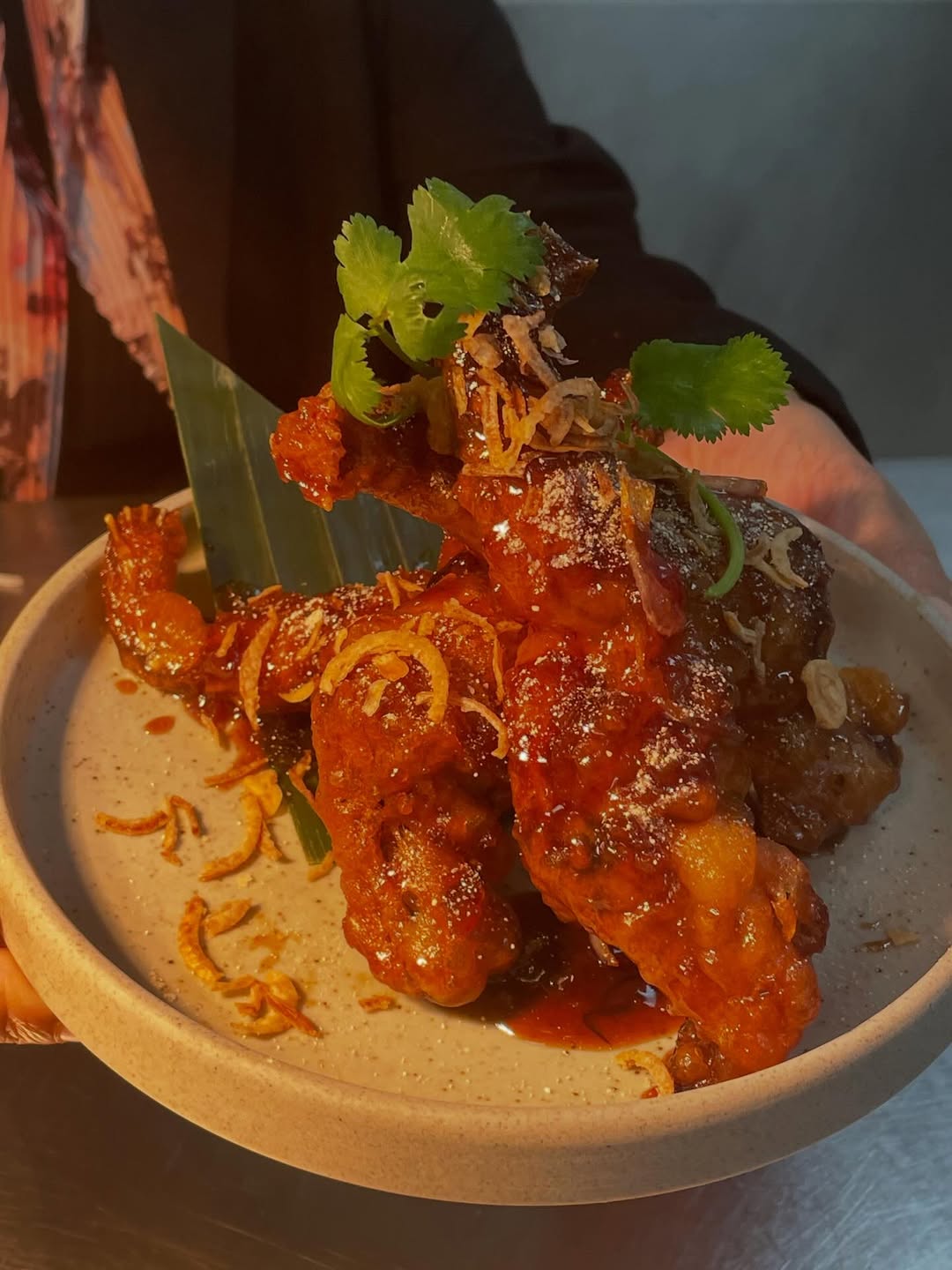 The Khao Soi Chicken Leg swims in a Northern Thai coconut curry with egg noodles, while the Naem Fried Rice leans on house made fermented sour pork for a sharp, tangy kick.