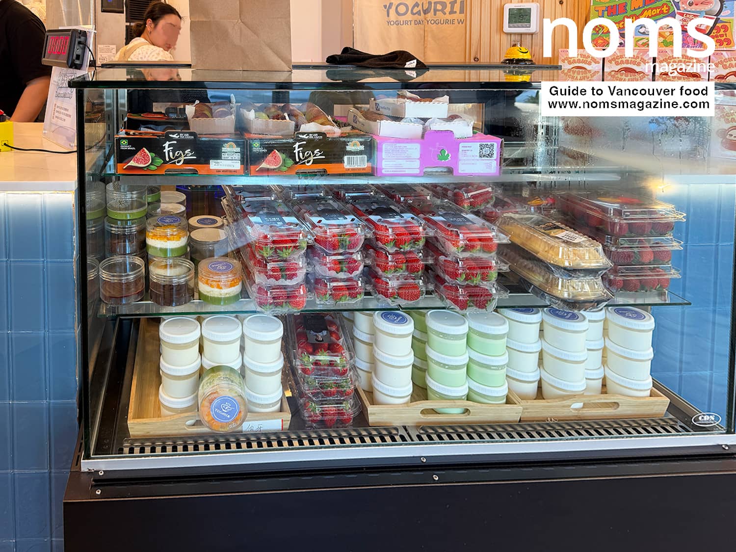 Behind the counter, there are also rows of pre-made yogurt cups and fresh berry containers available for grab-and-go.