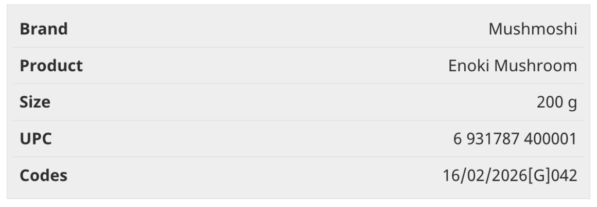 The product in question is the Mushmoshi brand Enoki Mushrooms.