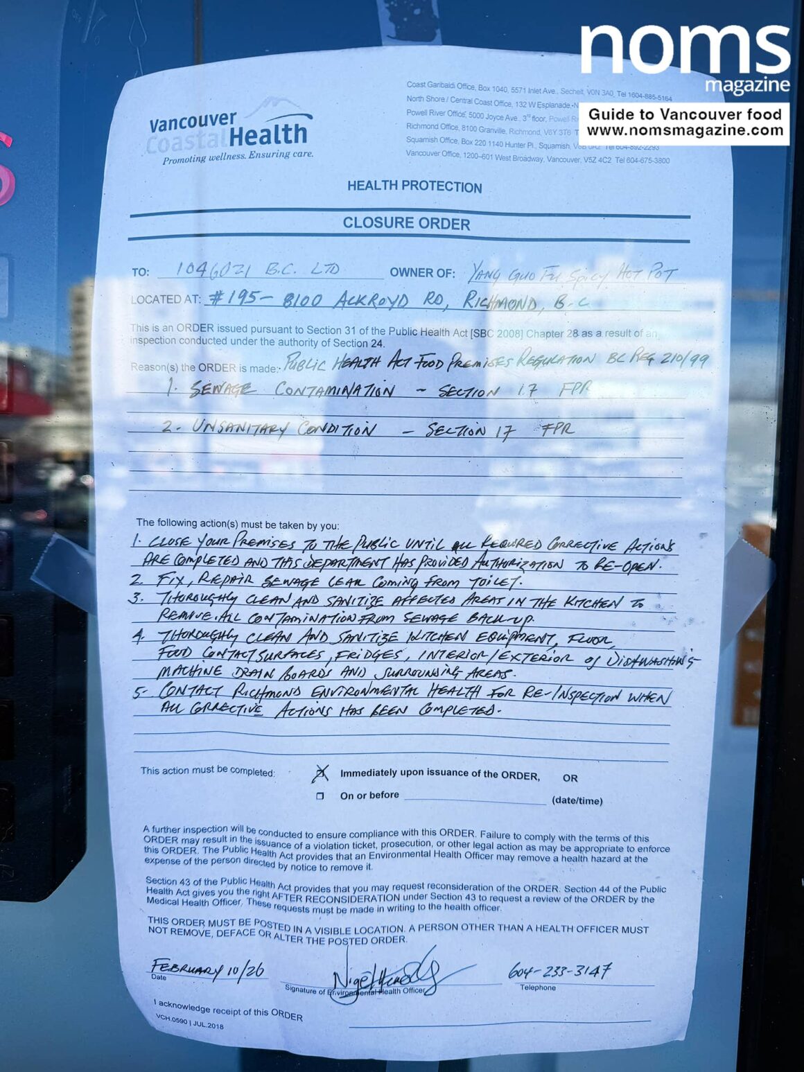 Vancouver Coastal Health issued closure orders on February 10 to Big Way Hot Pot, Yang Guo Fu (YGF) Malatang, and Gah Lok Dim Sum, all located at 8100 Ackroyd Rd in the Golden Village area.