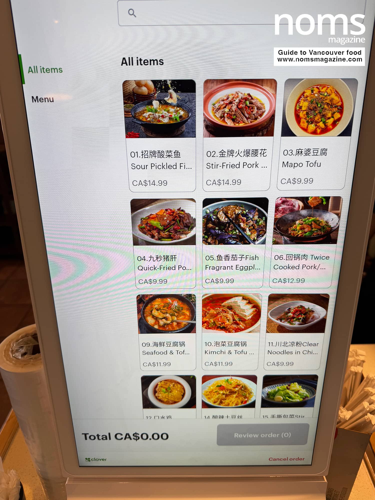 The menu features a lineup of classic Sichuan comfort dishes like Sour Pickled Fish, Mapo Tofu, and Twice Cooked Pork, with nothing priced above $14.99.