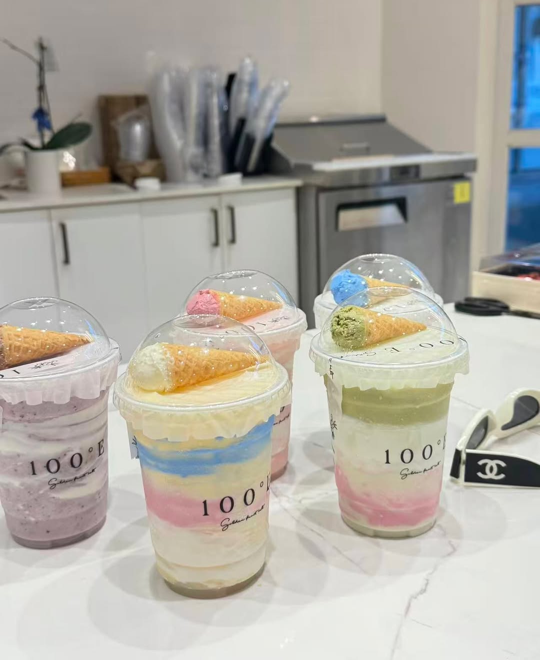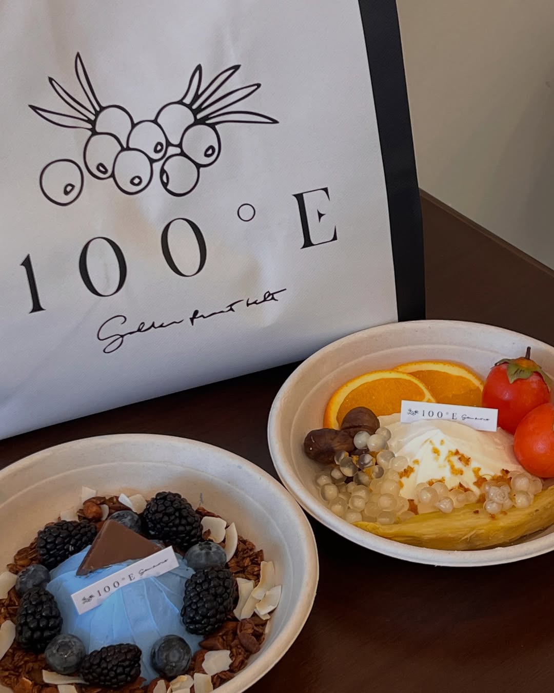 It refers to the 100° east longitude line, where the founders say the best fruits grow under endless sunshine — the symbolic heart of their concept, where “golden fruits meet cold brew yogurt.”