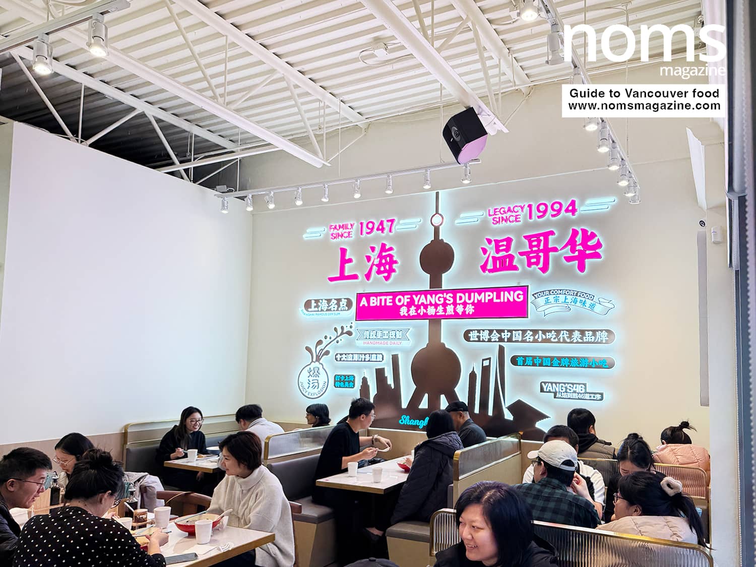 The space is surprisingly spacious, featuring a mix of booths and large communal tables under a massive neon sign depicting the Shanghai skyline.