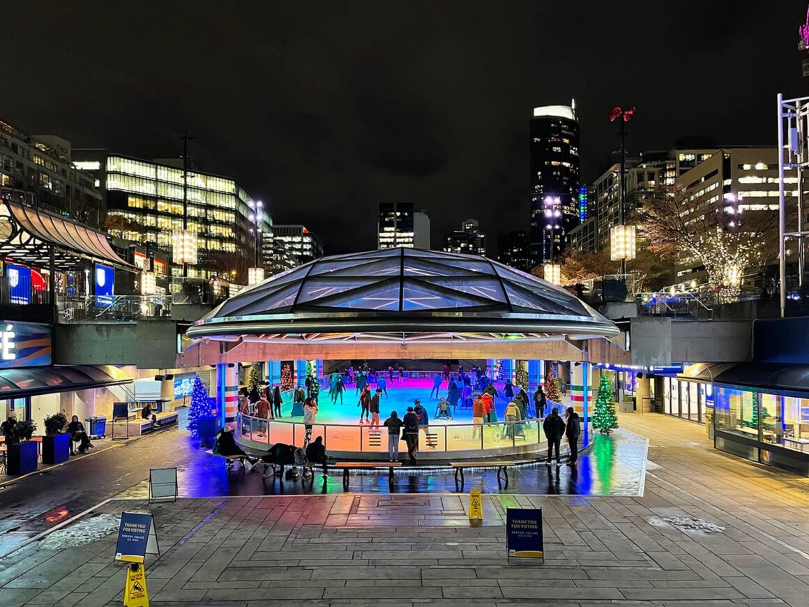 Robson Square’s outdoor rink is back with free skating downtown, plus hot chocolate and snacks on-site.