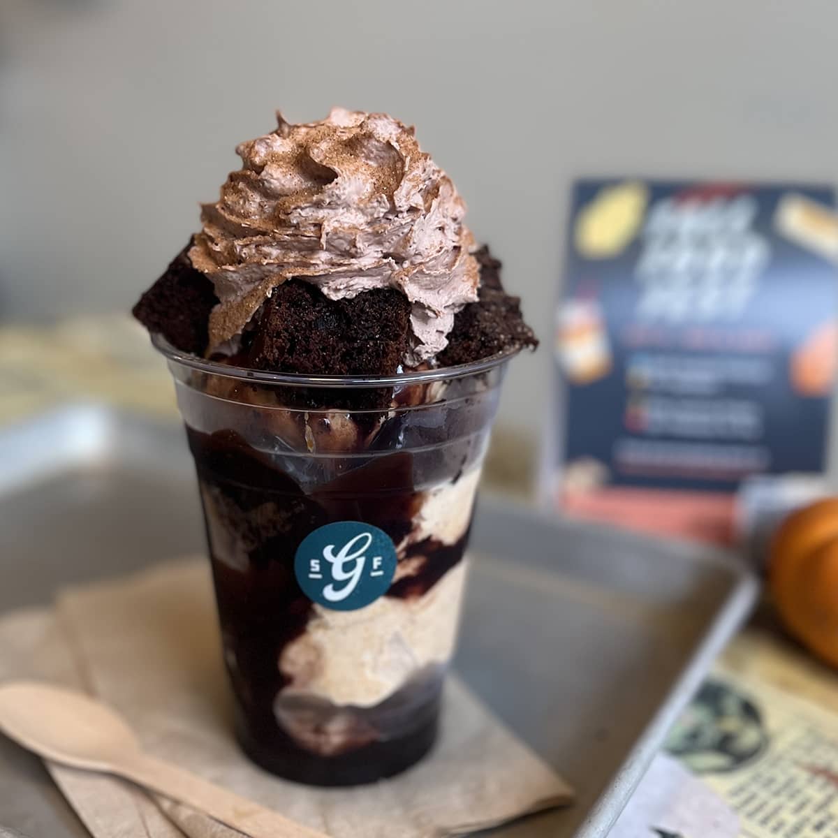 Pumpkin cheesecake ice cream layered with hot fudge and pumpkin-spiced chocolate cake. Topped with chocolate whipped cream and pumpkin pie spices.