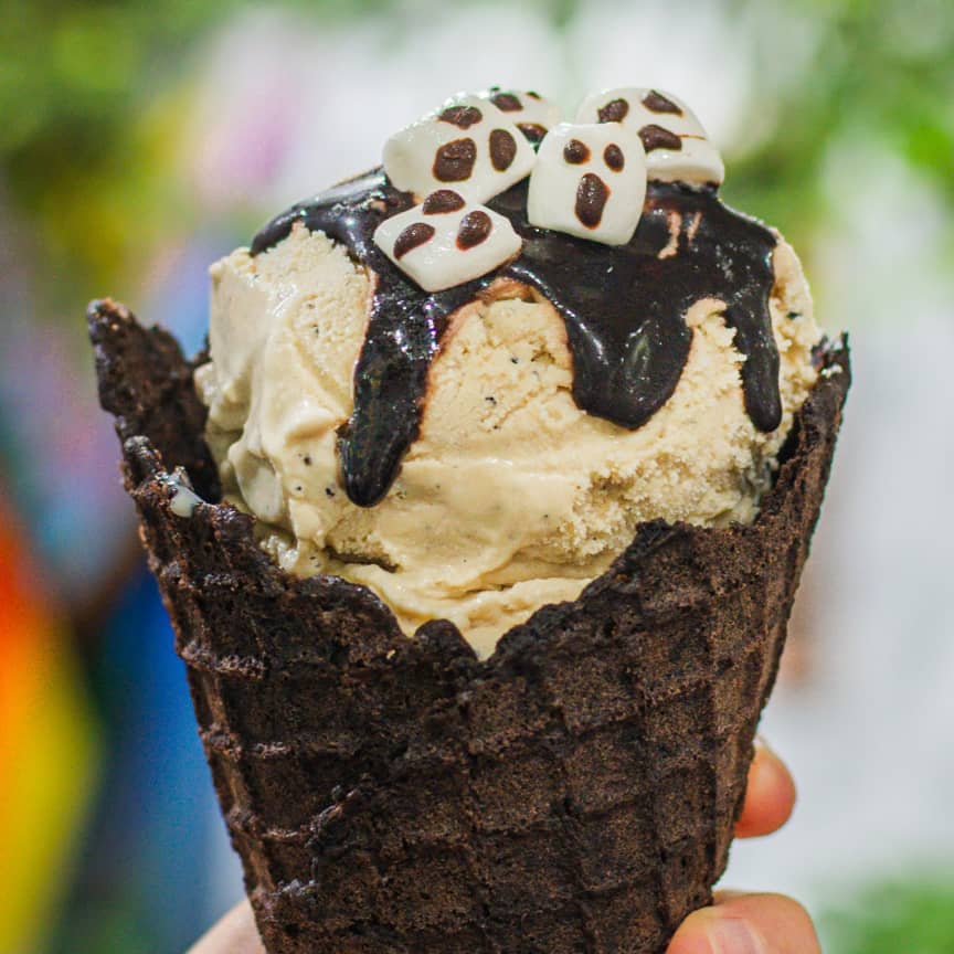 A black cocoa waffle cone with a burnt marshmallow ice cream, fudge sauce & ghost marshmallows