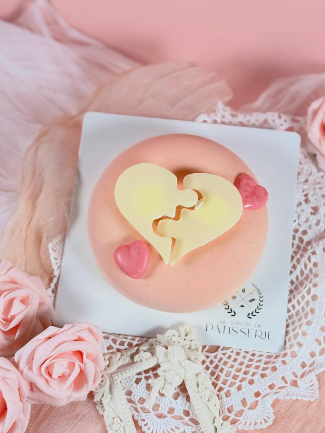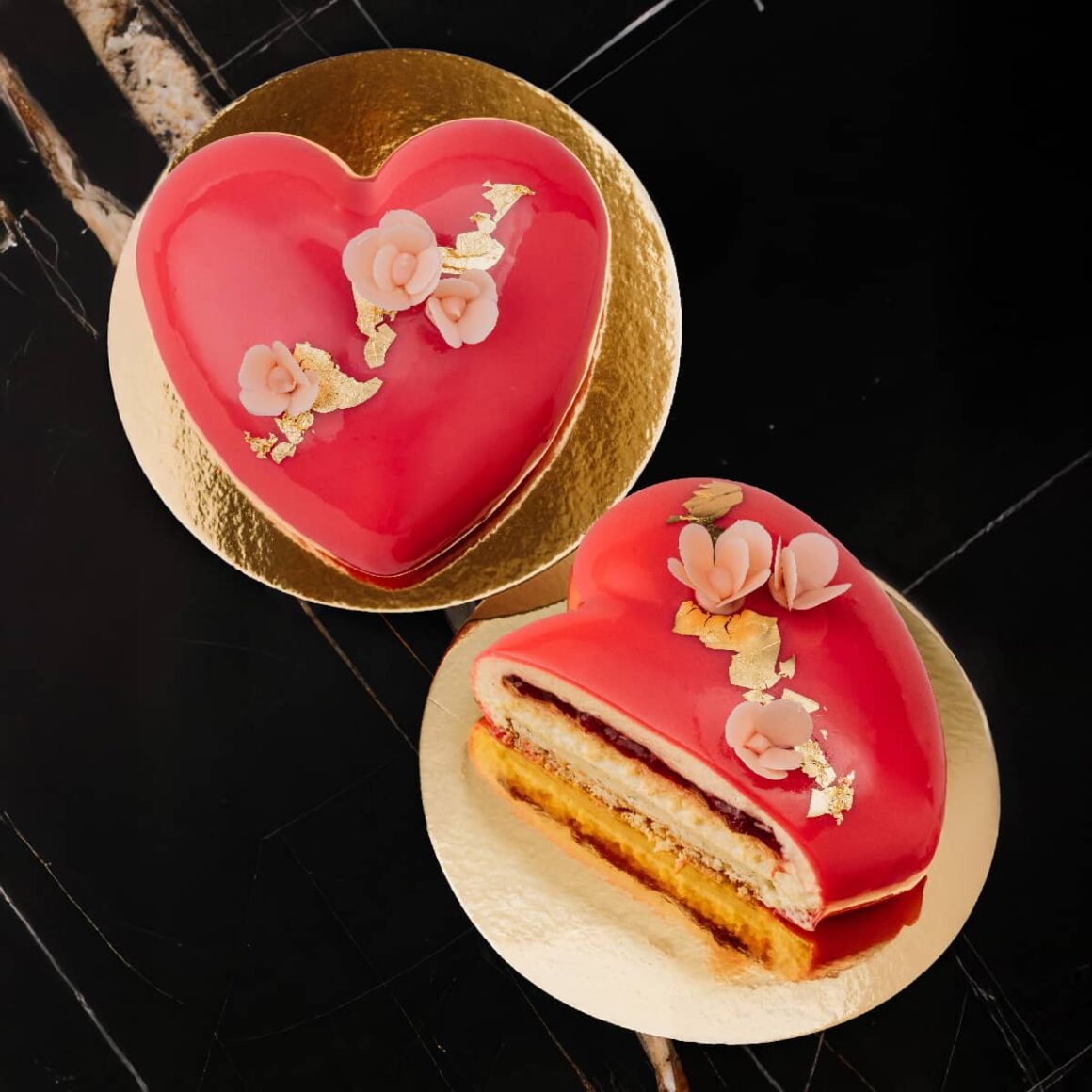 The “Lychee Rose” features a light lychee coconut mousse layered with refreshing raspberry crémeux and lychee confit, all sitting on a chiffon and cookie base.