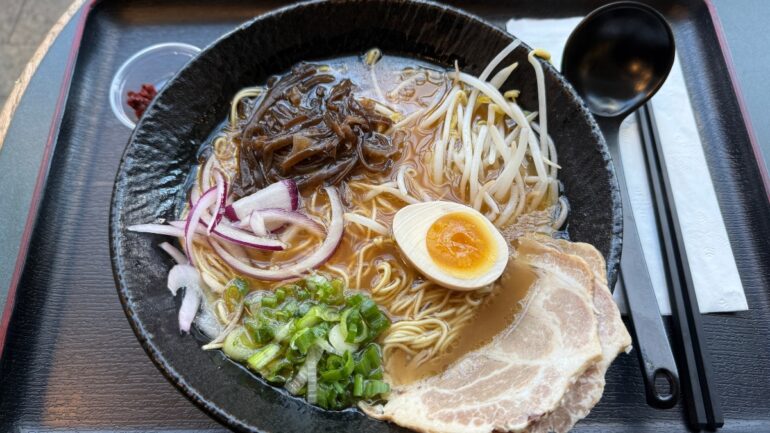 You’ll find ramen options like Tonkotsu Ramen made with pork broth, chashu, a soft-boiled egg, and spicy tare sauce, as well as a Vegan Tan Tan Ramen made with sesame broth, deep-fried tofu, mushrooms, and bean sprouts.