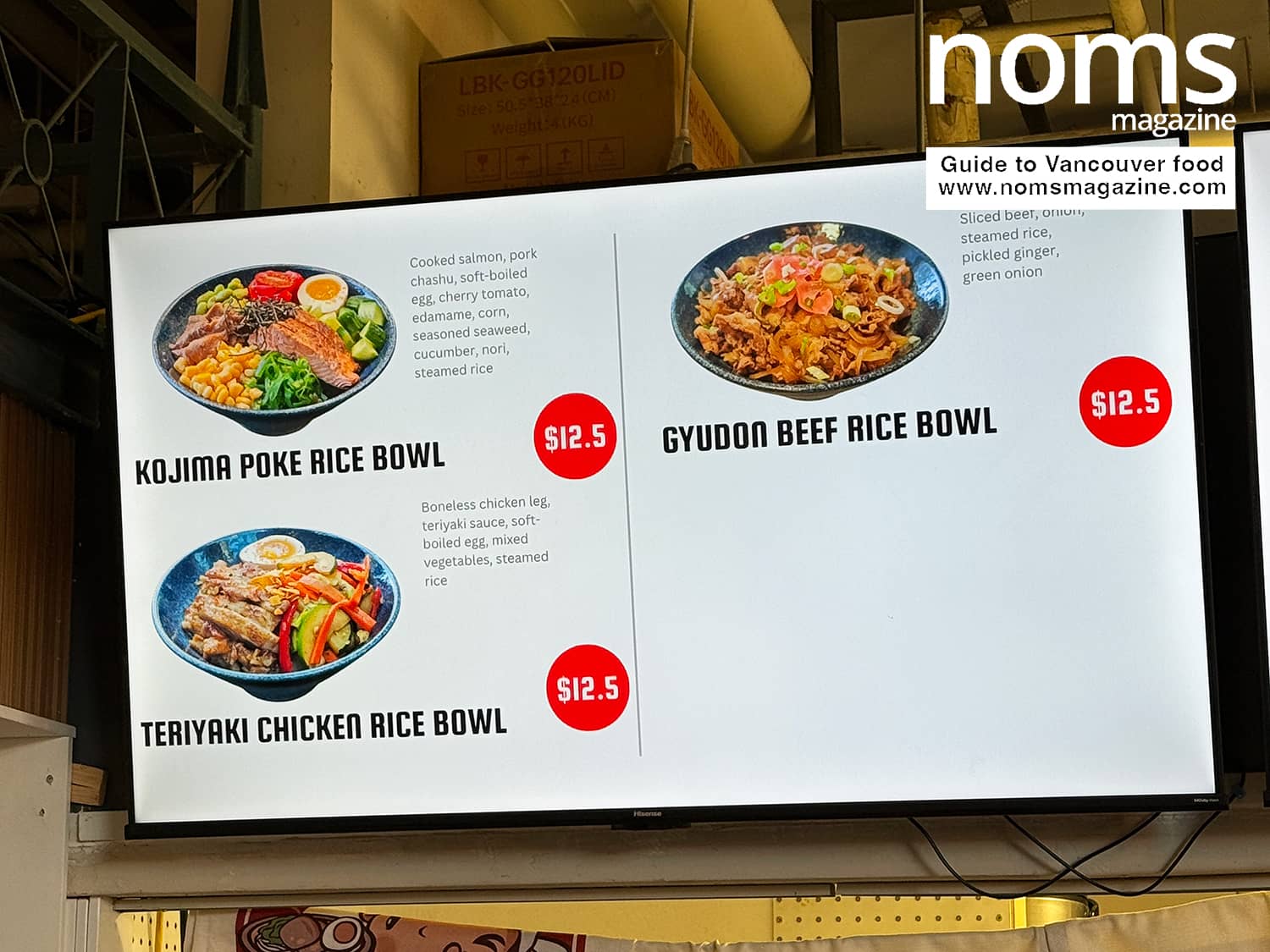 Beyond ramen, the stall serves a few rice bowls like Teriyaki Chicken, Gyudon Beef, and a signature Kojima Poke Rice Bowl with cooked salmon, pork chashu, and fresh veggies – all around $12.50.