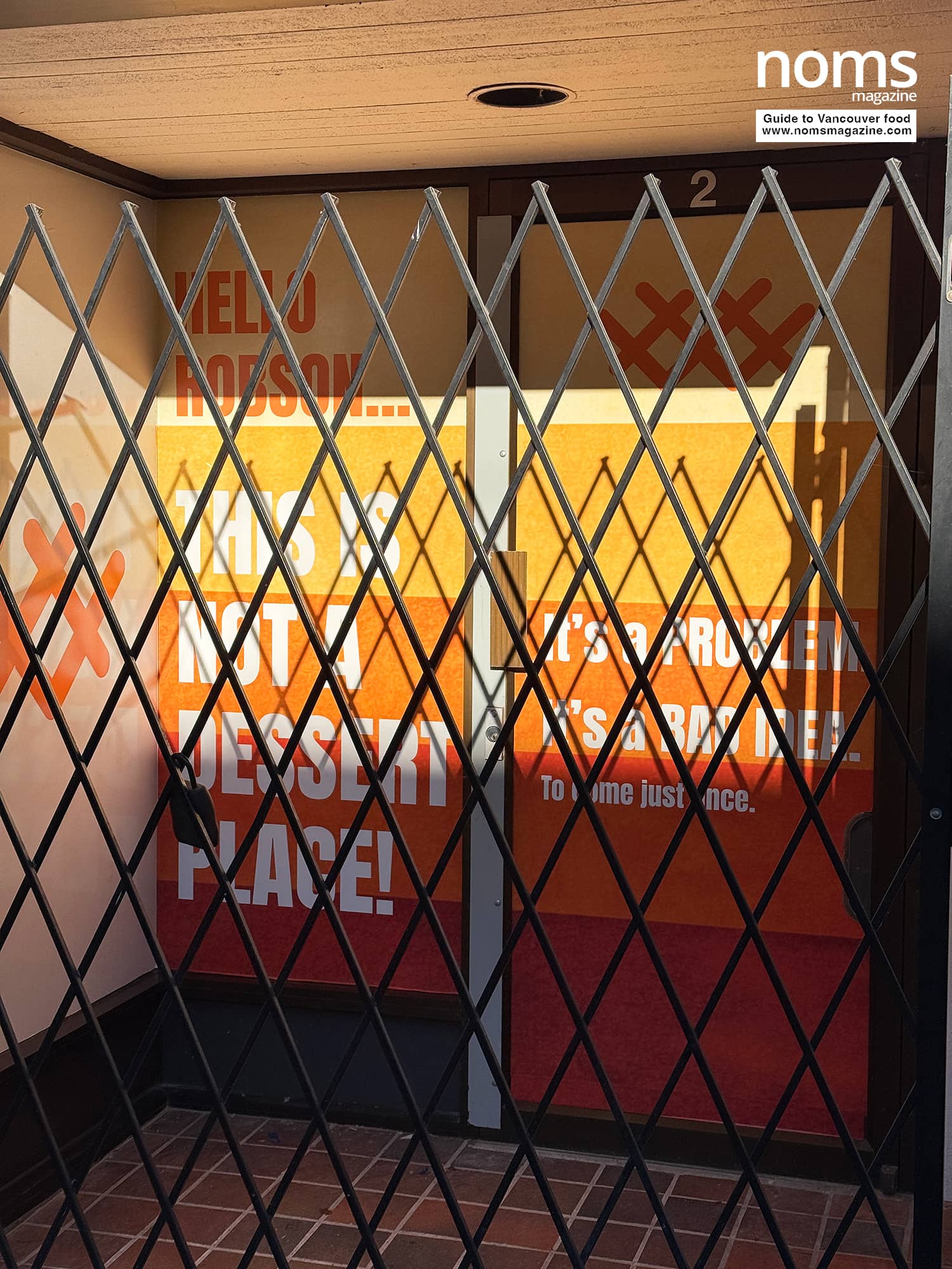 The window decals feature some cheeky marketing text that reads: “Hello Robson… This is NOT a dessert place! It’s a PROBLEM. It’s a BAD IDEA. To come just once.”